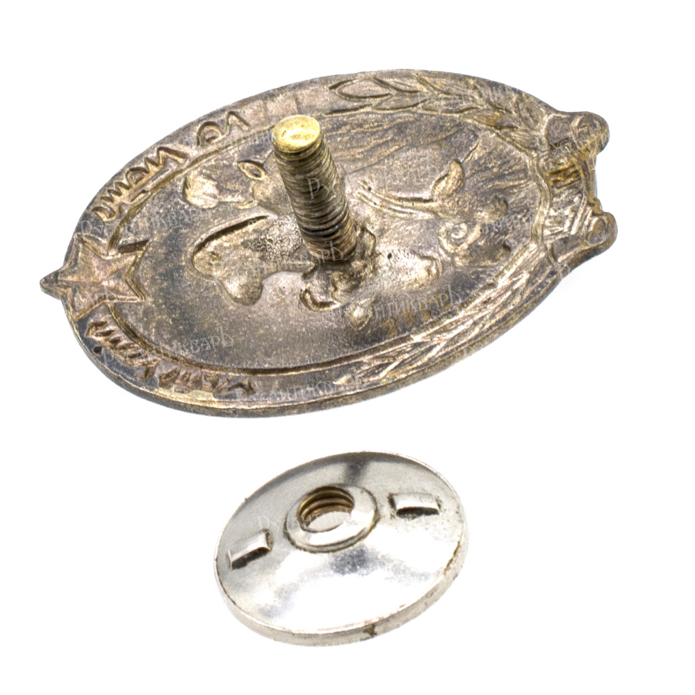 Ленинградский Монетный двор, конец 1930 - х - начало 1940 - х гг. Бронза, серебрение, позолота, эмаль, 16.3 гр. Размеры 43.9 × 34.7 мм. На оборотной стороне штихелем вырезан номер "2.352". Сохранность отличная (UNC-). Зак А. С., Калистратов И. Г. Воронченко В. Г. "Награды СССР за трудовую и общественную деятельность" № 267.