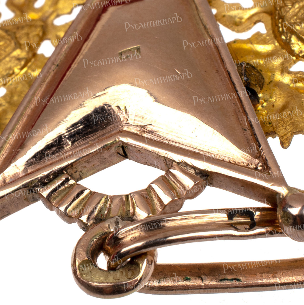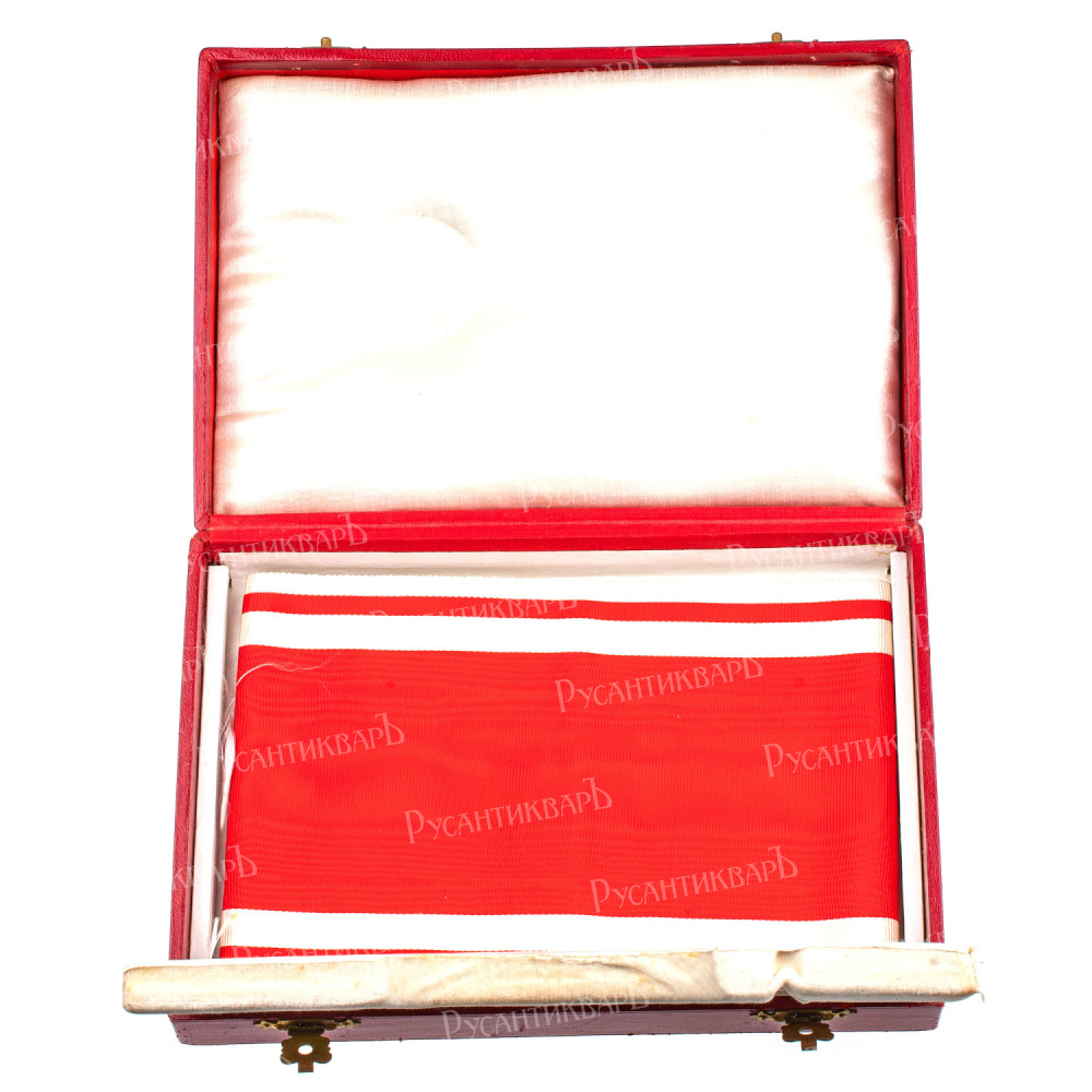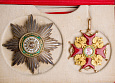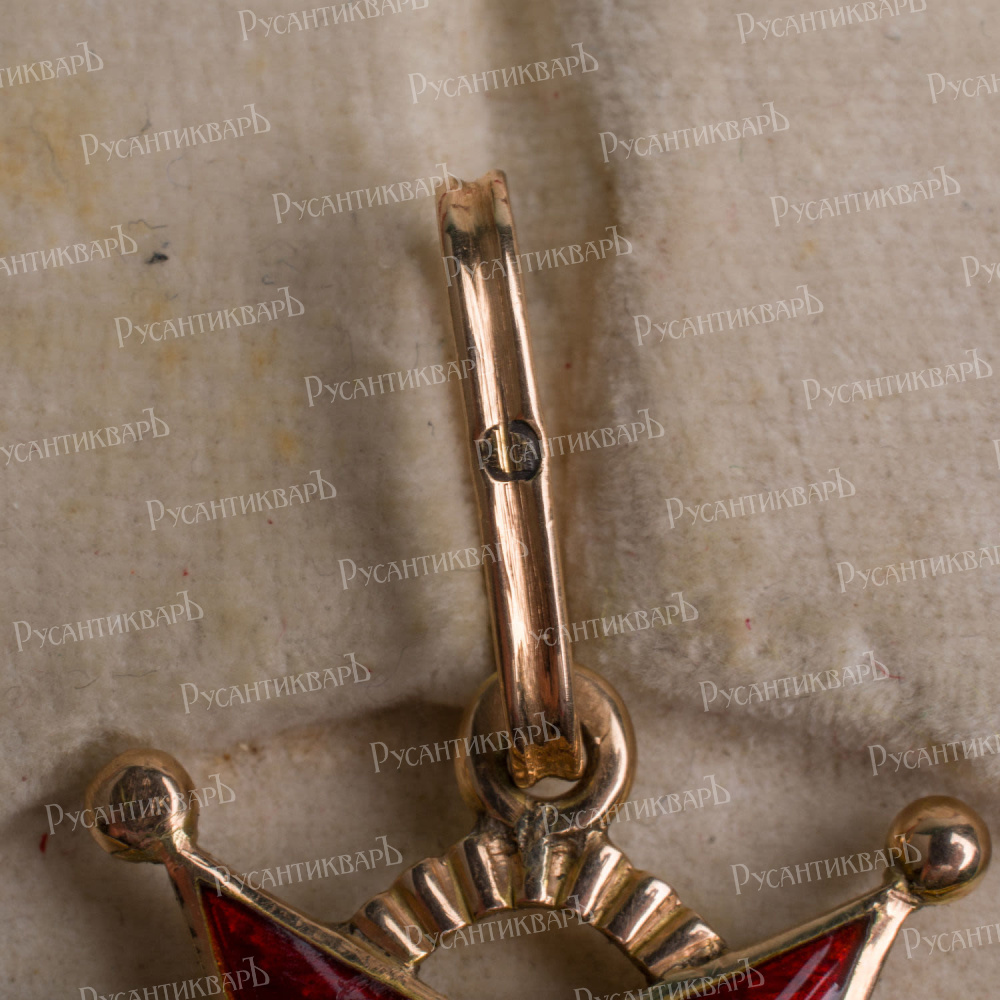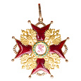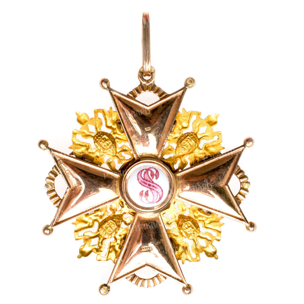 1. Знак ордена Св. Станислава 2 - й ст на орденской ленте. СПб, 1897 - 1908 гг. Фирма "Эдуард". Клейма: на оборотной стороне, на ушке - СПб окружного пробирного управления в овальном щитке ("альфа", женская головка в кокошнике, вправо, проба "56"); на концах креста, вверху - именное клеймо "ИЛ", внизу - клеймо фирмы "ЭДУАРДЪ"; на дужках горизонтальных концов, на шариках вверху справа и внизу слева и на соединительном звене - клеймо этого же пробирного управления в круглом щитке (женская головка в кокошнике, вправо, точка под подбородком). Золото, эмаль, шёлк (муар), 31.53 гр. Размеры 66.5 x 63.6 мм. Сохранность отличная (UNC).