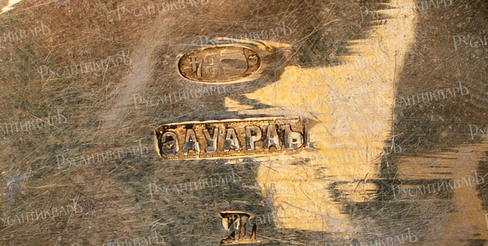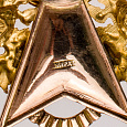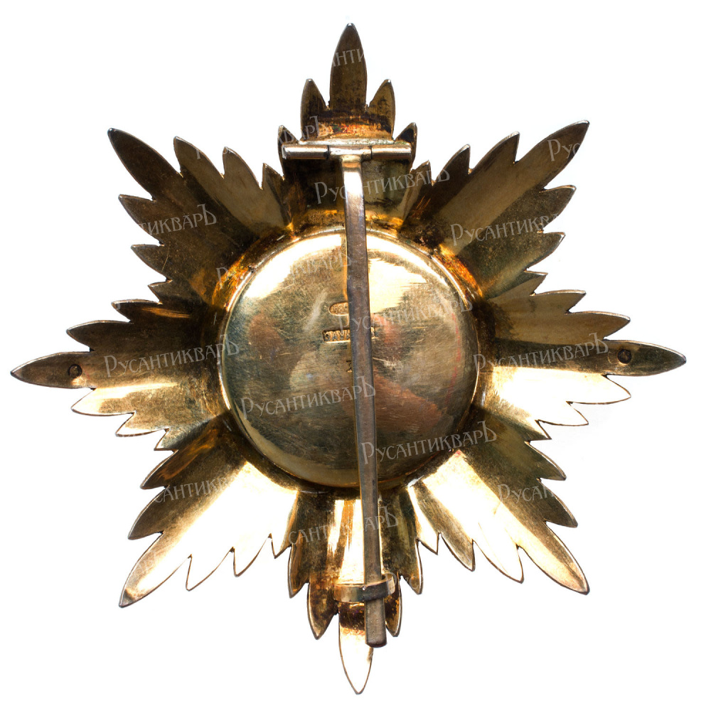 2. Звезда ордена Св. Станислава. СПб, 1897 - 1908 гг. Фирма "Эдуард". Клейма на оборотной стороне звезды: СПб окружного пробирного управления в овальном щитке (альфа, женская головка в кокошнике, вправо, "84"), клеймо фирмы "ЭДУАРДЪ" и именное клеймо "ИЛ"; на концах горизонтальных лучей звезды и на булавке с внутренней стороны - клеймо этого же пробирного управления в круглом щитке (женская головка в кокошнике, вправо, точка под подбородком). Серебро, позолота, эмаль, 58.44 гр. Размеры 90.4 × 90.2 мм. Сохранность очень хорошая, красивая патина, скол эмали (XF+).
