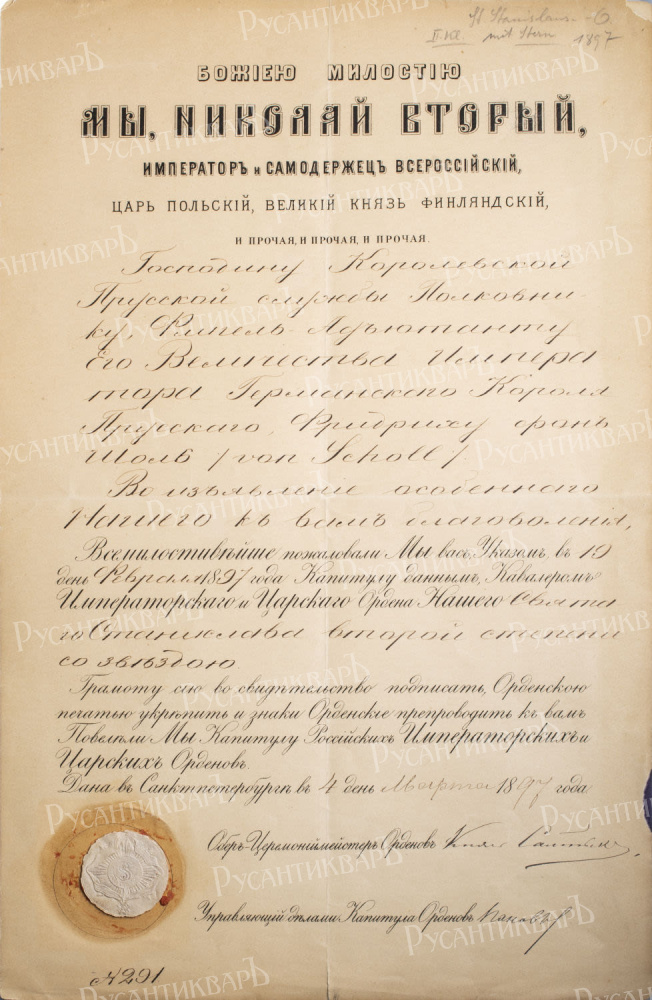 4. Грамота о пожаловании Прусского подданного, Господина Королевской Прусской службы Полковника, Флигель - Адьютанта Его Величества Императора Германского, Короля Прусского, Фридриха фон Штоля 4 марта 1897 г в кавалеры ордена Св. Станислава 1-й степени. Оригинал. Размеры 35.3 х 21.8 см. Сохранность очень хорошая (XF+).