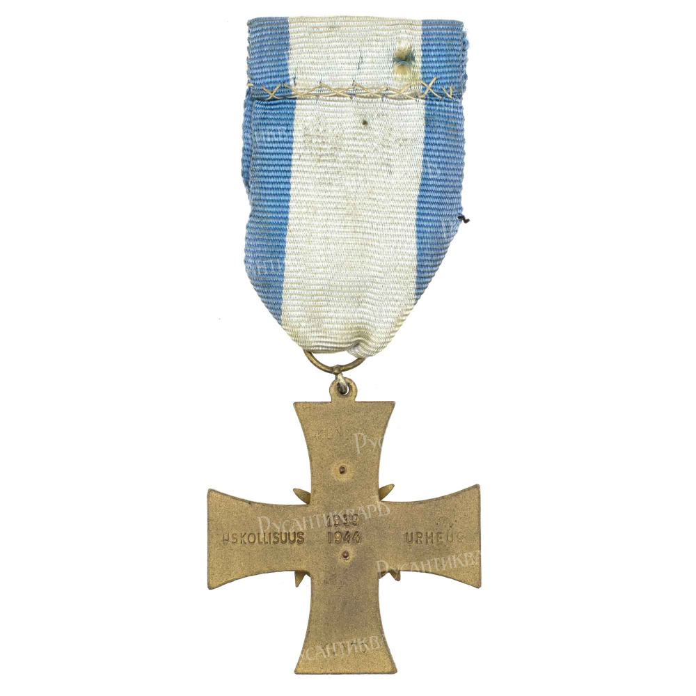 Стокгольм, шведская фирма "Спорронг и Ко" (Sporrong & Co), 1941 - 1945 гг. Дизайн разработал К. Киллинен. Оксидированное железо, золочение, эмаль, 12.7 гр. Размеры 44.9 х 41.1 мм. Сохранность отличная (UNC-). Тарас Д. А. "Боевые наградысоюзников Германии во II Мировой войне" стр 142. Глушко В. В. "Ордена, медали, памятные знаки Финляндии 1809 - 2009", стр 173, № 424. Borna Barac "Reference Catalogue Orders, Medals and Decorationsof the World", Croatia, Zagreb, 2013. том 2, стр 495, № 57. Довольно редкий (Р).