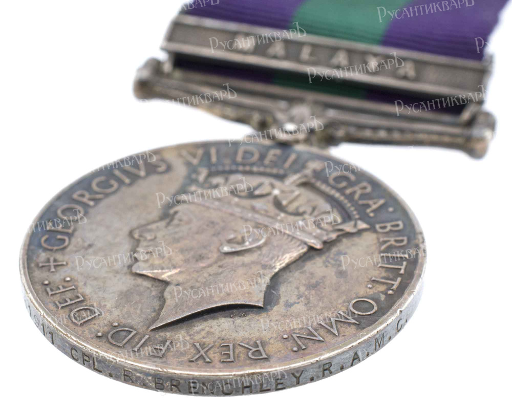 Медаль "За Общие Заслуги", планка "МАЛАЙЯ". На гурте: "726191" (номер службы); CPL (corporal - воинское звание капрал); R. BRENCHLEY. (имя и фамилия награждённого); R.A.М.C. (THE ROYAL ARMY MEDICAL CORPS / Медицинский корпус Королевской армии).