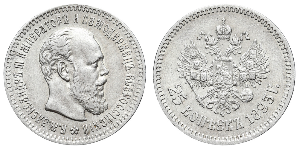 Период правления Императора Александра III (1 марта 1881 - 20 октября 1894 гг). СПб Монетный двор. Серебро. Тираж 8.008 экз. Сохранность АU 58.