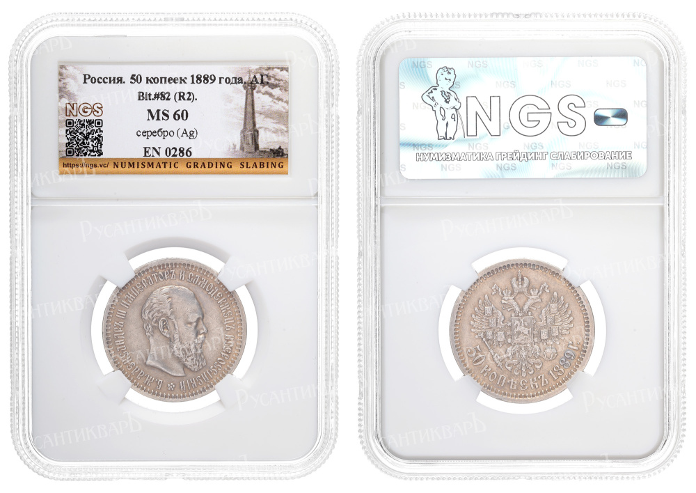 50 копеек 1889 год "АГ" (R2), в слабе NGS, MS 60.