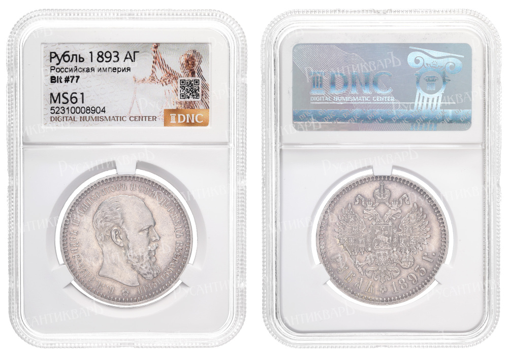 Рубль 1893 год "АГ" в слабе DNC, MS 61