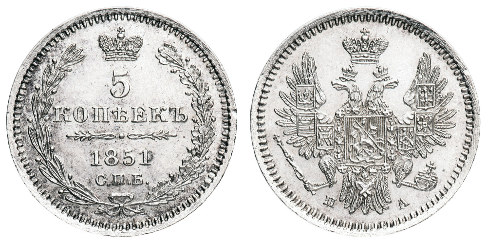 5 копеек 1851 год "СПБ - ПА".
