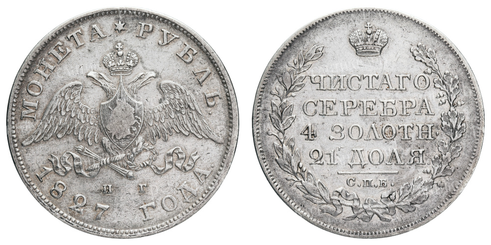 Период правления Императора Николая I (19 ноября 1825 - 18 февраля 1855 гг). СПб Монетный двор. Серебро, 21.05 гр. Тираж 584.005 экз. В. В. Биткин "Сводный каталог монет России" № 104. Сохранность AU.