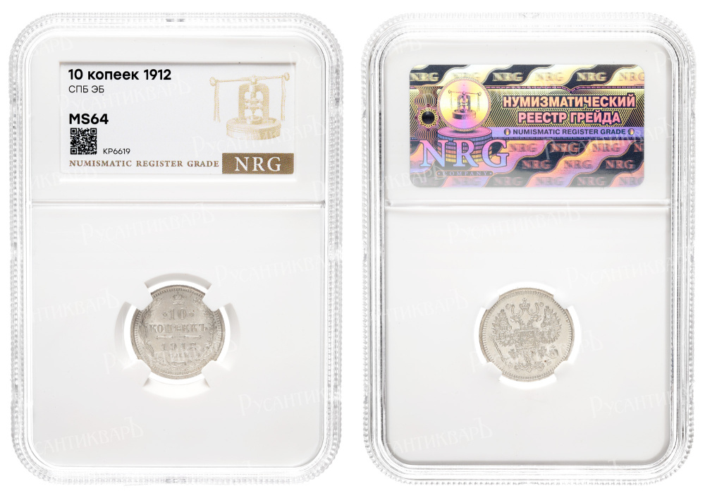 10 копеек 1912 года "СПБ - ЭБ" в слабе NRG, MS 64.