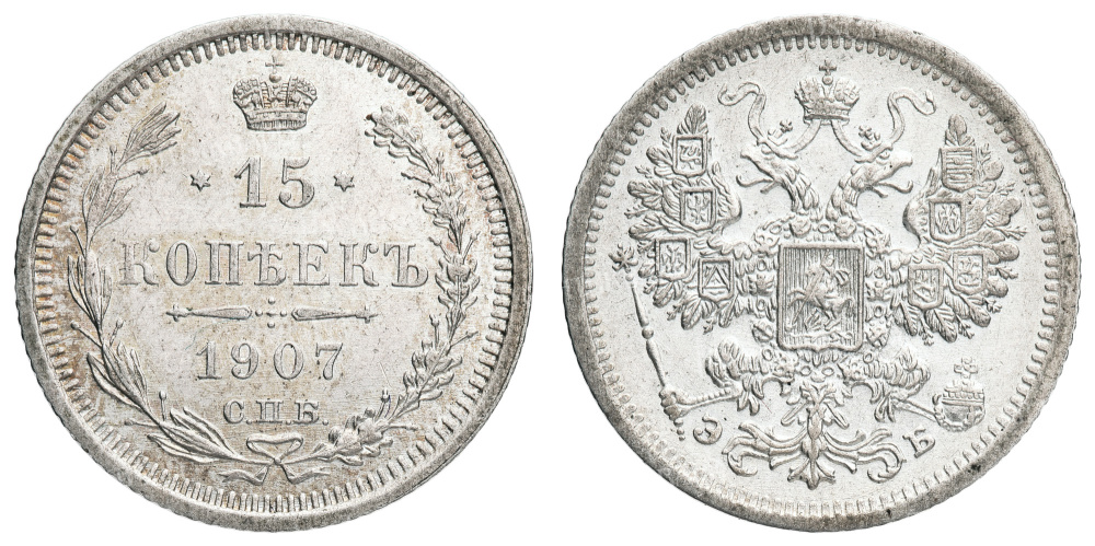 15 копеек 1907 год "СПБ - ЭБ".