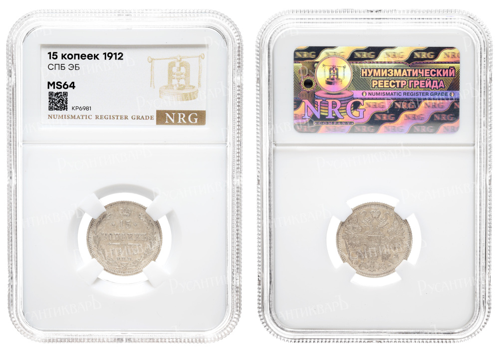 15 копеек 1912 год "СПБ - ЭБ" в слабе NRG, MS 64.