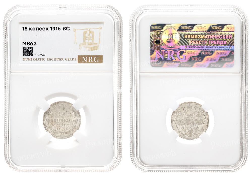 15 копеек 1916 год "ВС" в слабе NRG, MS 63.