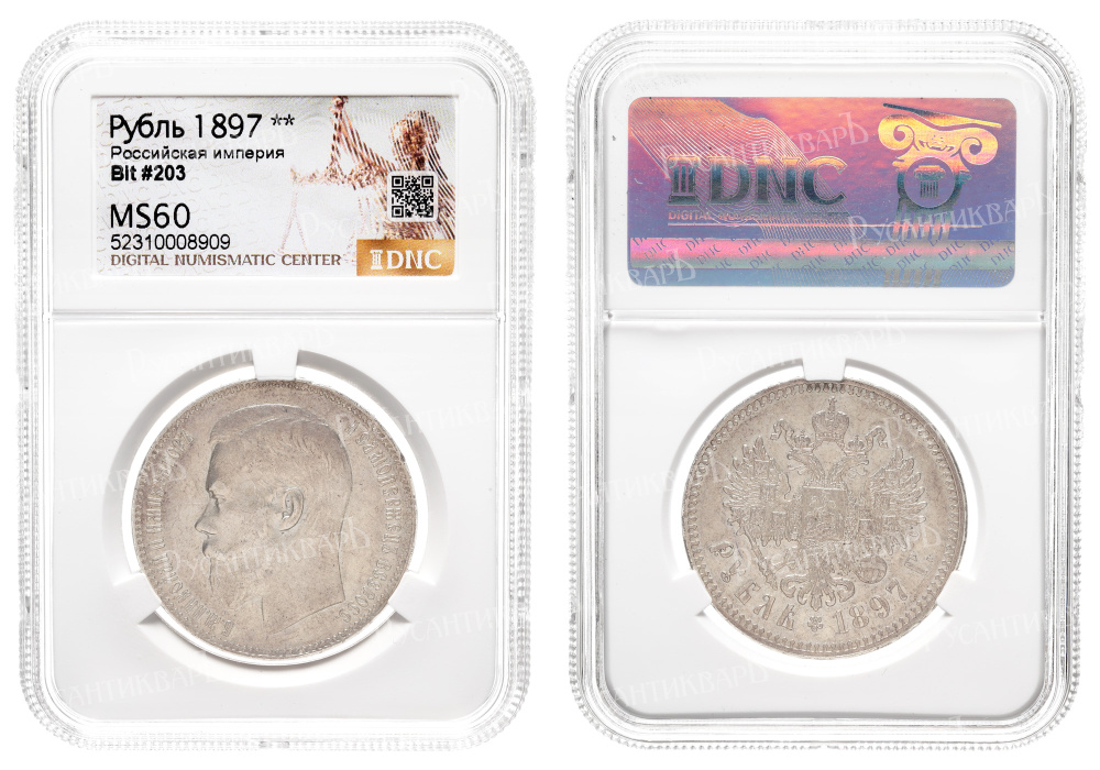 Рубль 1897 год "★★" в слабе DNC, MS 60.