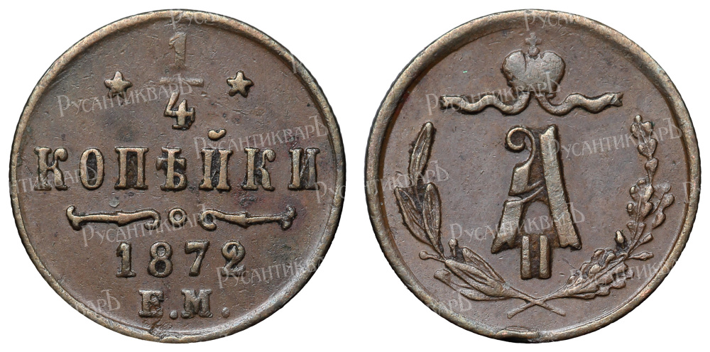 Период правления Императора Александра II (18 февраля 1855 - 1 марта 1881 гг). Екатеринбургский Монетный двор. Медь, 0.83 гр. Тираж 540.000 экз. В. В. Биткин "Сводный каталог монет России" № 447. Сохранность AU.