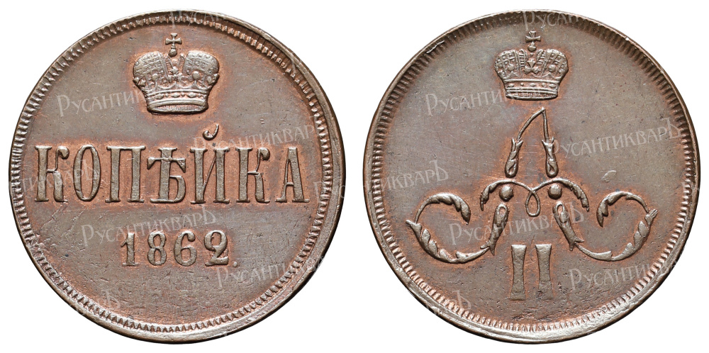 Копейка 1862 год "ЕМ" (буквы стерты).