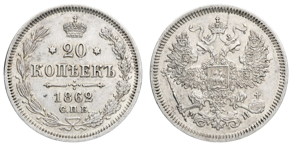 20 копеек 1862 года "СПБ - МИ".