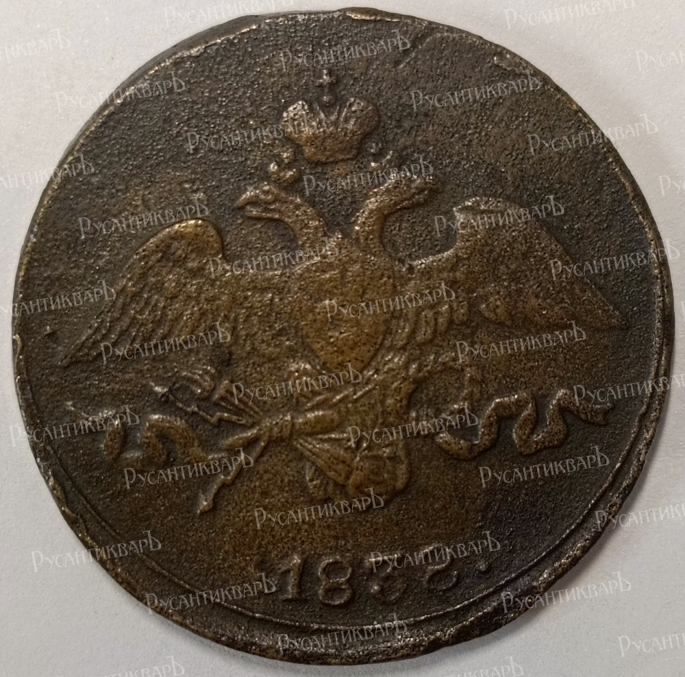 Период правления Императора Николая I (19 ноября 1825 - 18 февраля 1855 гг). Сузунский Монетный двор. Медь, 8.57 гр. Тираж 10.500.000 экз. В. В. Биткин "Сводный каталог монет России" № 697. Сохранность VF.