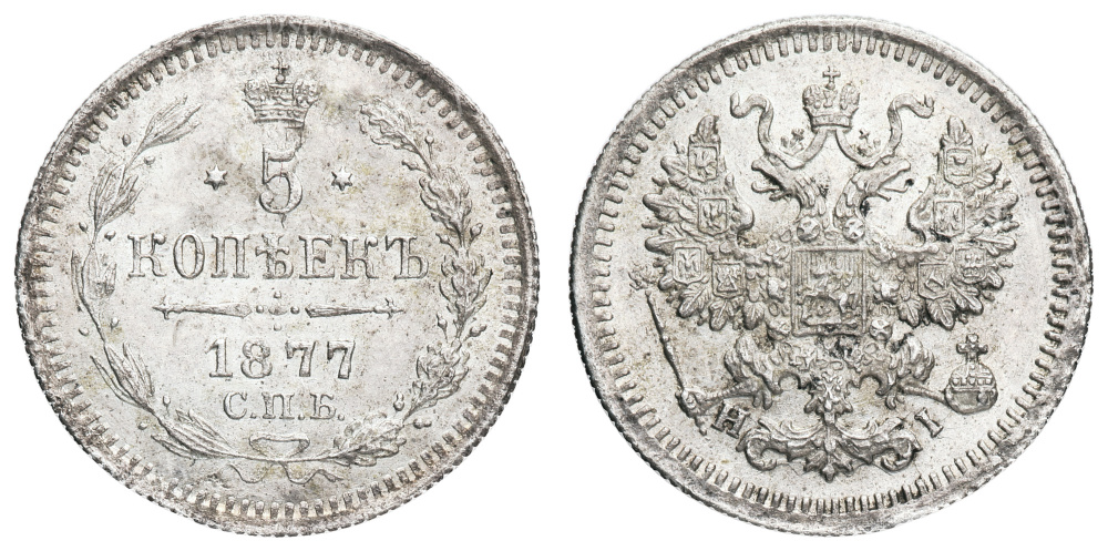 Период правления Императора Александра II (18 февраля 1855 - 1 марта 1881 гг). СПб Монетный двор. Серебро, 0.77 гр. Тираж 200.003 экз. В. В. Биткин "Сводный каталог монет России" № 278. Сохранность XF/AU.