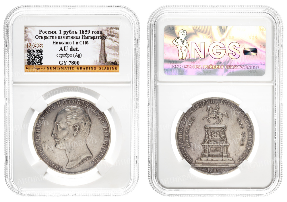 Рубль 1859 год “Конь”, В память открытия монумента Императору Николаю I в Санкт - Петербурге" в слабе NGS, AU det