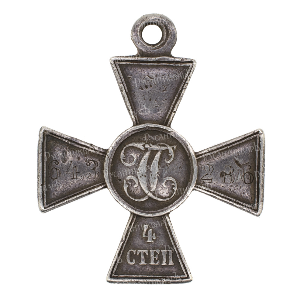 Георгиевский Крест 4 ст за номером 643.286 выдан за отличие во время Первой Мировой войны 1914 - 1918 гг. ФИО кавалера не установлена.