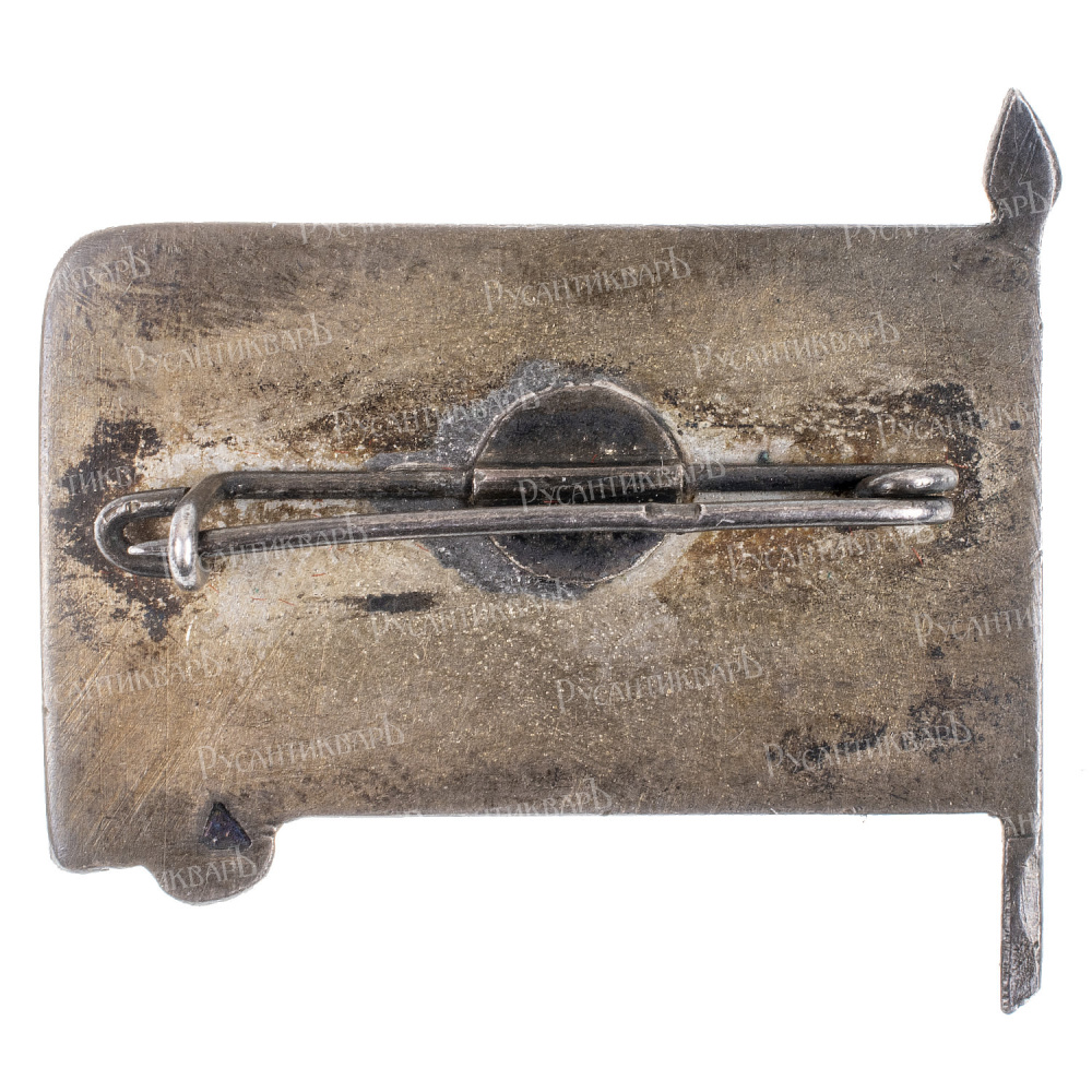 Неизвестная мастерская, 1924 г. Булавочное крепление, зажимная игла горизонтального направления с "ловящим крюком". Серебро, эмаль, 14.1 гр. Размеры 31.75 х 29.05 мм. Сохранность очень хорошая (XF+). Редкий (Р1).