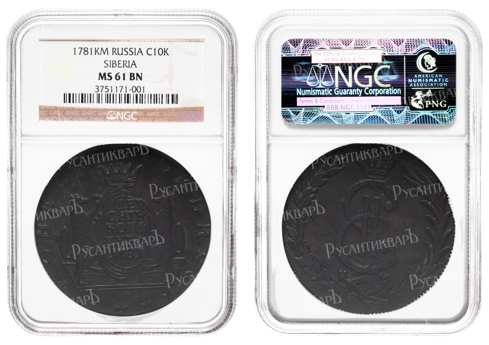 10 копеек 1781 года "КМ" Сибирская монета" в слабе NGC, MS 61 BN