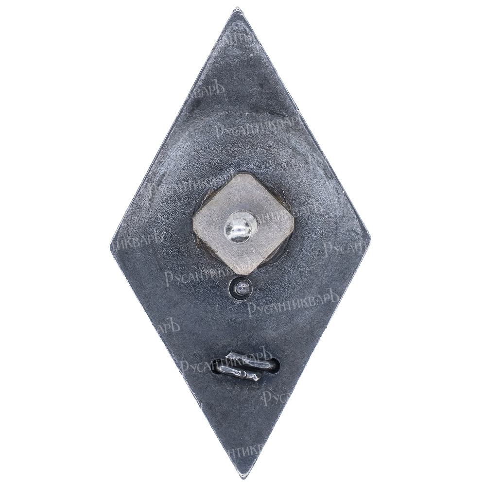 Московский Монетный двор, 1954 - 1957 гг. На прижимной гайке выбито "МОНЕТНЫЙ / ДВОР". Серебро, позолота, эмаль, 18.00 гр. Размеры 41.86 х 21.24 мм. Сохранность отличная (UNC). Думанский Ю.В. "Нагрудные знаки высших учебных заведений Вооруженных Сил СССР (1950 - 1957)". Каталог - справочник. Донецк, 2005. стр. 59.