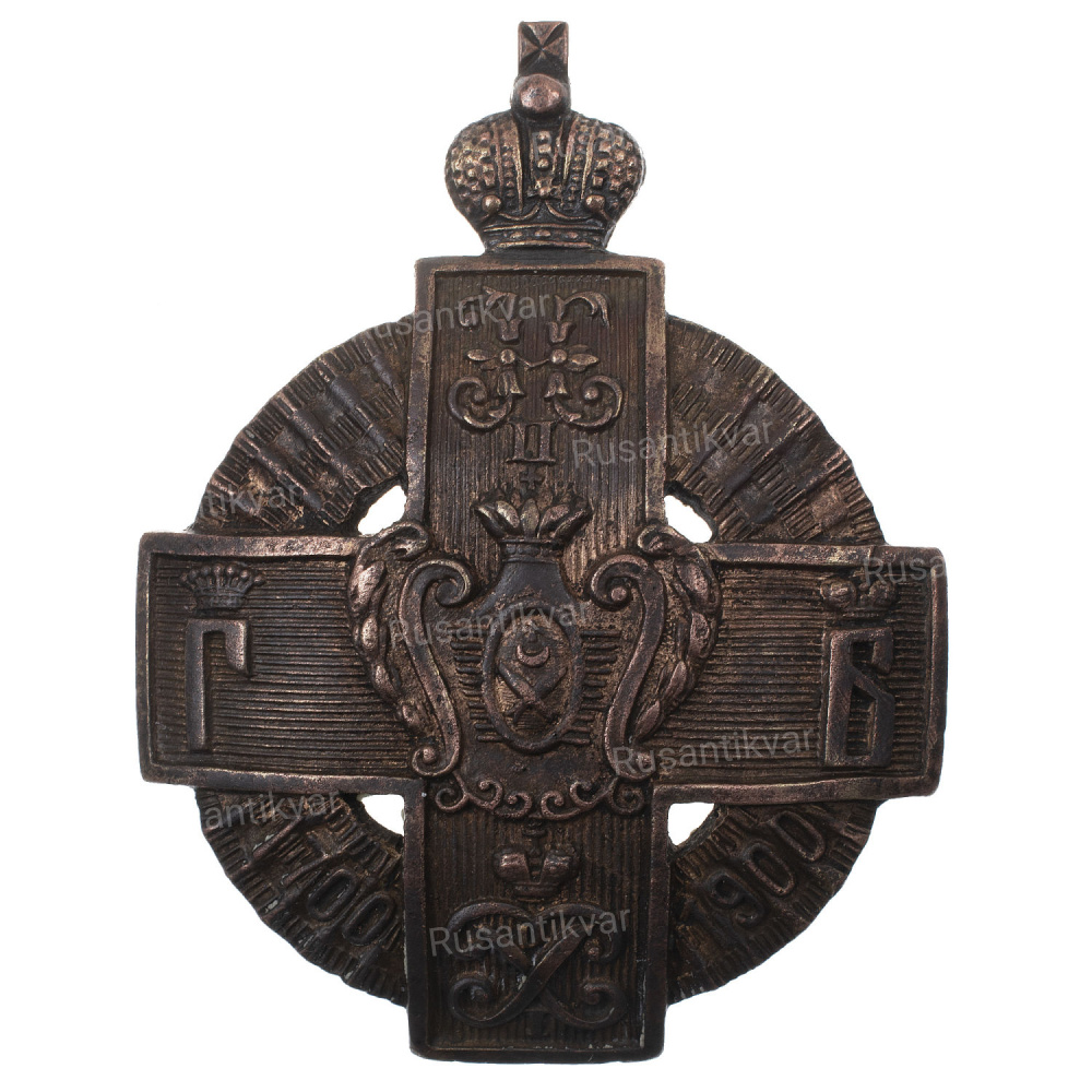 увенчанный золотой Императорской короной. На нижних сегментах кольца из Георгиевской ленты расположены золотые даты "1700" и "1900".