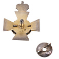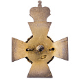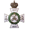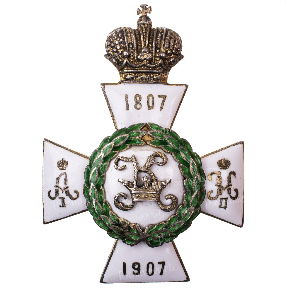 СПб, неизвестная мастерская. Клейма на об. ст. знака: СПб окружного пробирного управления в овальном щитке [альфа, женская головка в кокошнике, вправо, 84] и именное клеймо «ВП». Серебро, позолота, эмаль, 23,51 г. Размеры 50,2×36,5 мм. Сохранность отличная (UNC+). Патрикеев, Бойнович.1# 1.4.1. Утвержден 23 декабря 1906 г.