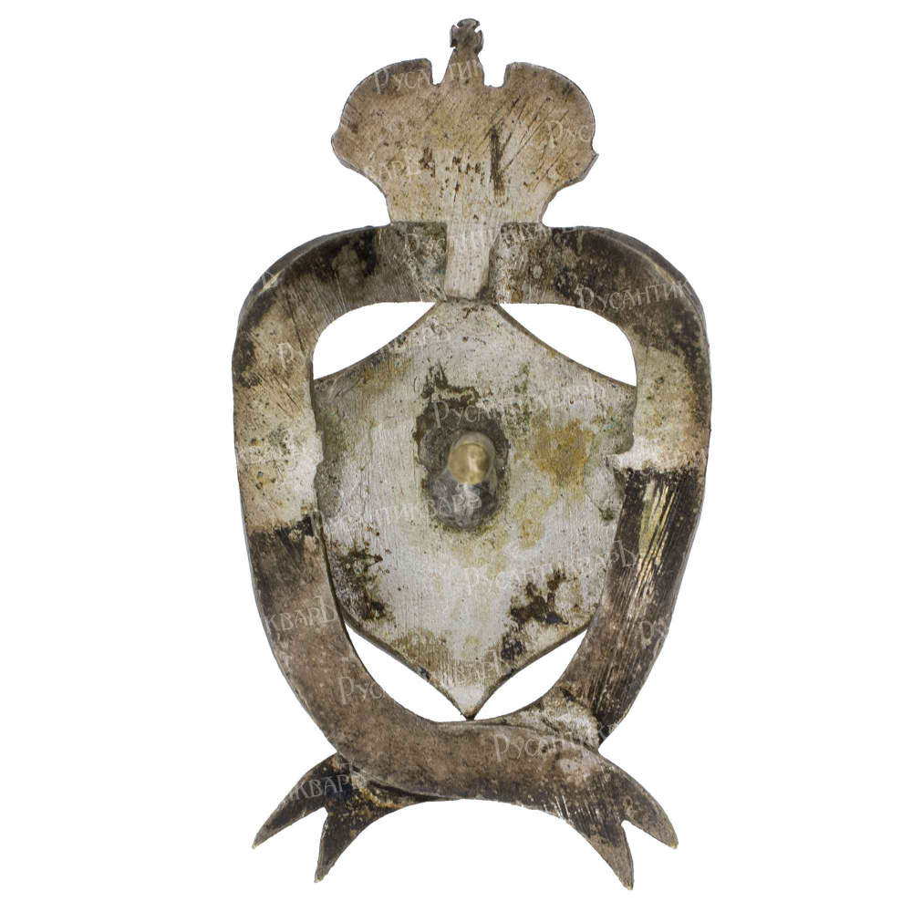 Лента увенчана золотой Императорской короной. Внутри нее золотой геральдический щиток с накладной серебряной Андреевской звездой.