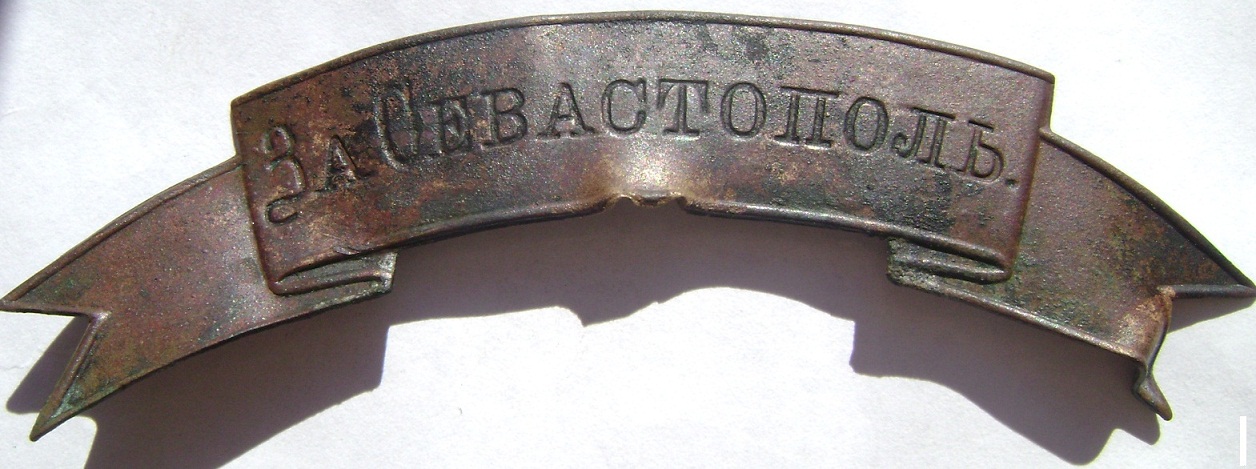 Лента с надписью "За Севастополь." по Высочайшему приказу по Морскому Ведомству от 22го сентября 1855 года за мужество и храбрость, оказанные при обороне Севастополя в 1854-1855 годах пожалованы на арматуру киверов 29му,30му,31му,32му,33му,34му,35му,36му,37му,38му,39му,40му,41му,42му,43му,44му и 45му флотским экипажам. По Высочайшему приказу по Морскому Ведомству от 6го мая 1886 года Черноморскому Флоту, взамен отличий на киверах, пожалованных за оборону Севастополя, носить Георгиевские ленточки на фуражках нижним чинам с названием корабля или флотского экипажа.