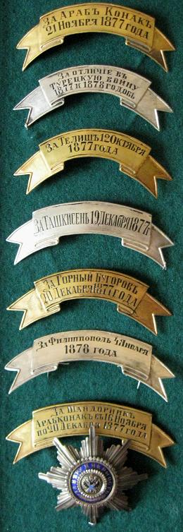 Подобных знаков отличия было достаточно много. Вот только ряд примеров: «За отличие в Турецкую войну 1877—1878 годов», «За горный Дубняк 12 октября 1877 года». За Кавказскую войну коллективные знаки отличия на головные уборы получили 23 полка и артиллерийских бригады, за Восточную (Крымскую) войну – 37 частей, за походы в Средней Азии – 15 частей. За участие в этих кампаниях наградные знаки жаловались и гвардейским полкам. За время Русско-японской войны 1904-1905 года знаки отличия смогли получить уже 59 различных полков, артиллерийских бригад и казачьих батарей.