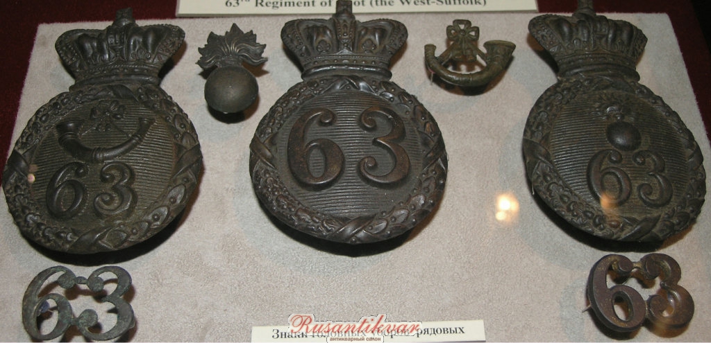 Комплект киверных знаков и знаков на фуражные шапки нижних чинов батальонных, стрелковой и гренадерской рот 63-го Западно-Саффолкского пехотного полка (фото из Музея Шереметьевых).