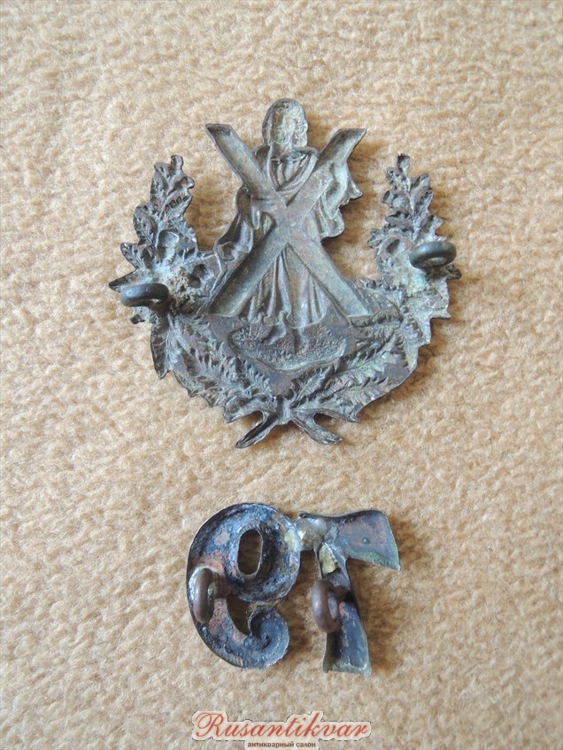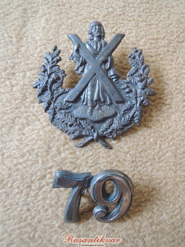 Комплект знаков с головного убора нижних чинов 79-го (Шотландские горцы Камерона) пехотного полка, штамп, белый металл.