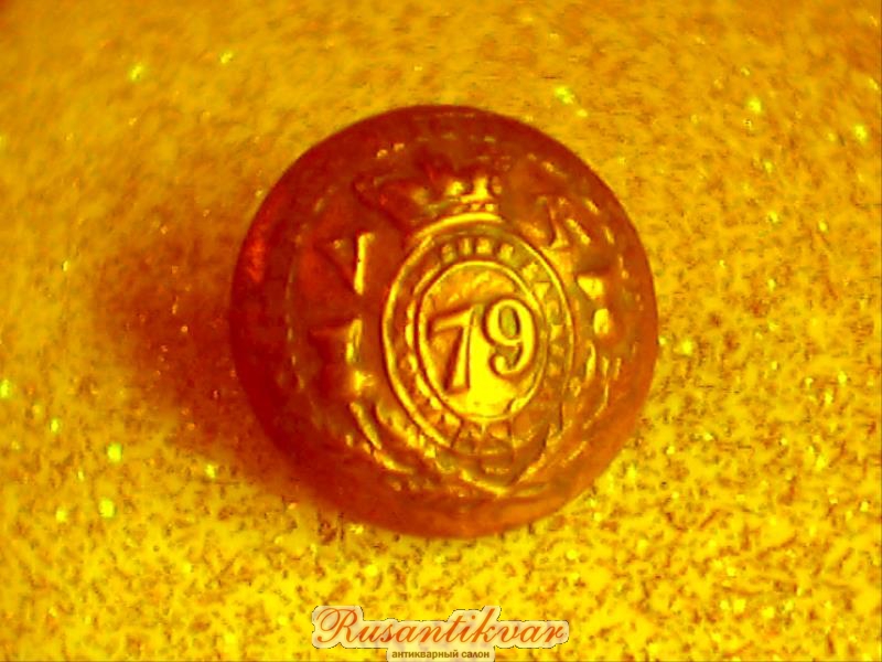 Пуговица офицерская, латунь позолота, диаметр 21 мм.Описание сюжета: в центре номер 79 арабскими цифрами вокруг в ленте девиз: Nemo me impune lacessit в венке из чертополоха,вся композиция увенчана короной по сторонам от которой две аббривиатуры V и R (Victoria Regina) и выше надпись по верхнему краю пуговицы - Cameron Higthlanders