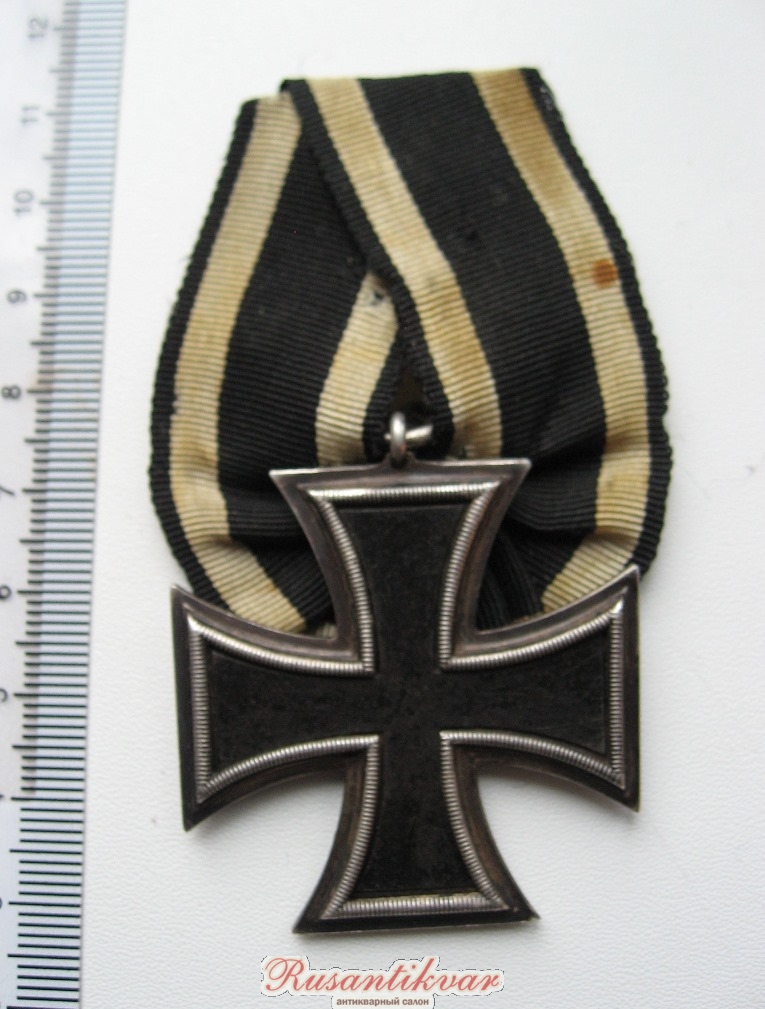 Железный крест 2-го класса образца 1813 года. Аверс и Реверс.Знак 2-го класса имел размеры 42х42 мм и при помощи припаянного к верхнему лучу креста поперечного ушка и продетого в него кольца подвешивался на шёлковую ленту шириной 25-30 мм. Наряду с крестами, выпущенными официально, существовало большое количество знаков 2-ой степени частного производства, которые могли несколько отличаться от оригинала как по размерам (встречались варианты с расстоянием между концами креста от 28 до 42 мм), так и по качеству исполнения. Очень быстро среди прусских солдат и офицеров распространилась странная мода - носить Железные кресты оборотной стороной вперёд, хотя официально ношение знаков ордена подобным образом было разрешено только в 1838 году, когда Фридрих-Вильгельм III утвердил новые рисунки лицевой и оборотной сторон креста, поменяв их местами. Аверс. Лицевая сторона была чистой. Черное железо в окантовке из серебряной рамки. Реверс. В центре оборотной стороны креста (на черной железной вставке) барельеф в виде трех расходящихся дубовых листьев. Над ними, на верхнем луче, помещался вензель основателя награды короля Фридриха Вильгельма III – литеры «FW» (нем. Friedrich Wilhelm). На нижнем луче помещалась дата основания ордена – цифры «1813». Ленты отличались в зависимости от обстоятельств получения награды. Лента_вторго_класса.png Лента была черной, с идущими по краям белыми полосами (с черной каймой). PRU_Non-combatant_ribbon.png Тем награждённым, которые получали крест не за боевые заслуги, он вручался на белой ленте с чёрной окантовкой.