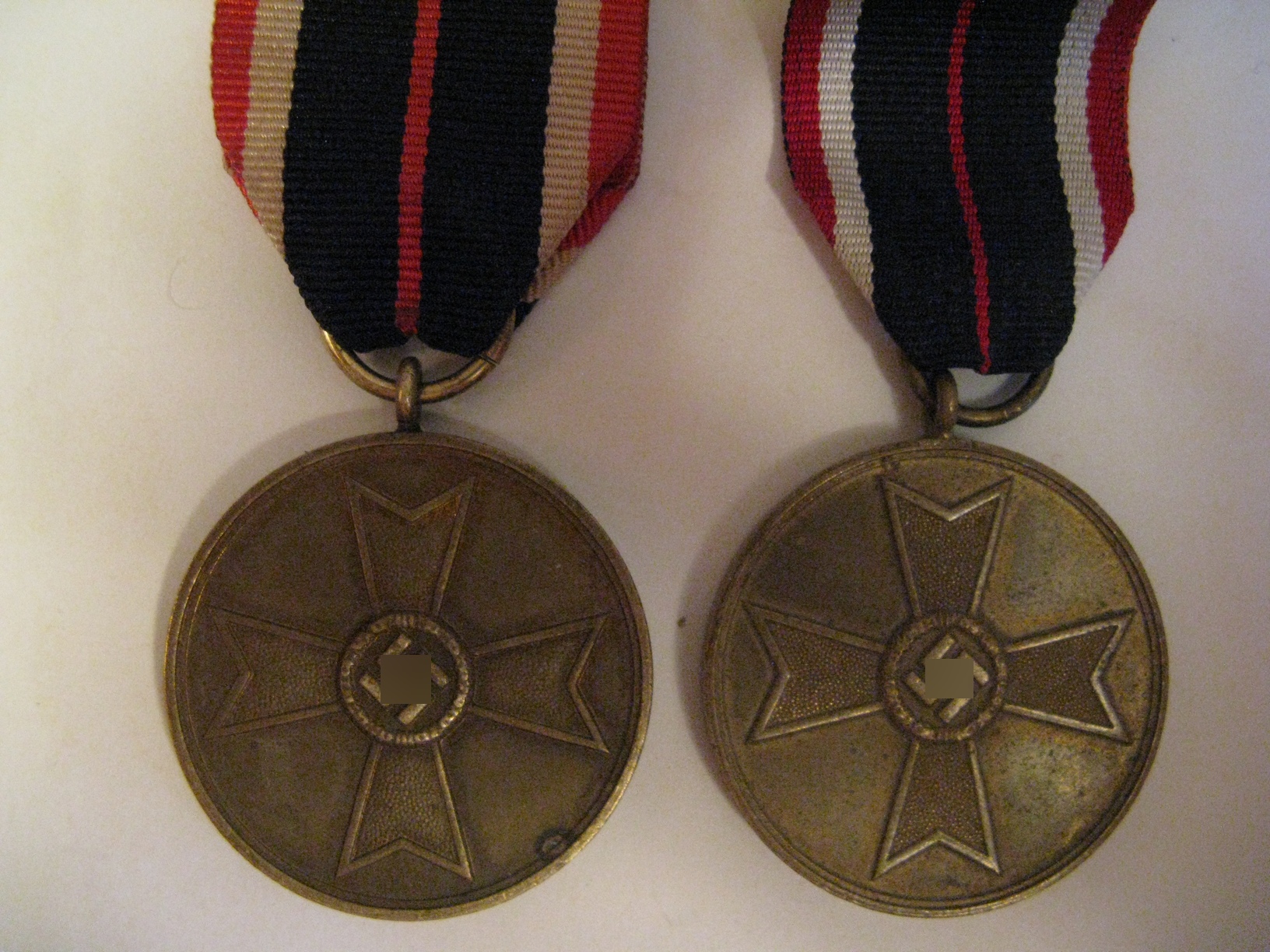 Медаль Креста Военных заслуг. K.V.K. Учреждена 19 августа 1940 года. Материал - Бронза. Диаметр - 32 мм. ВЕС- 13.8 Грамм. На фото- 2 разных производителя- различие в толщине " паука" и ширине дубовых листьев на венке.