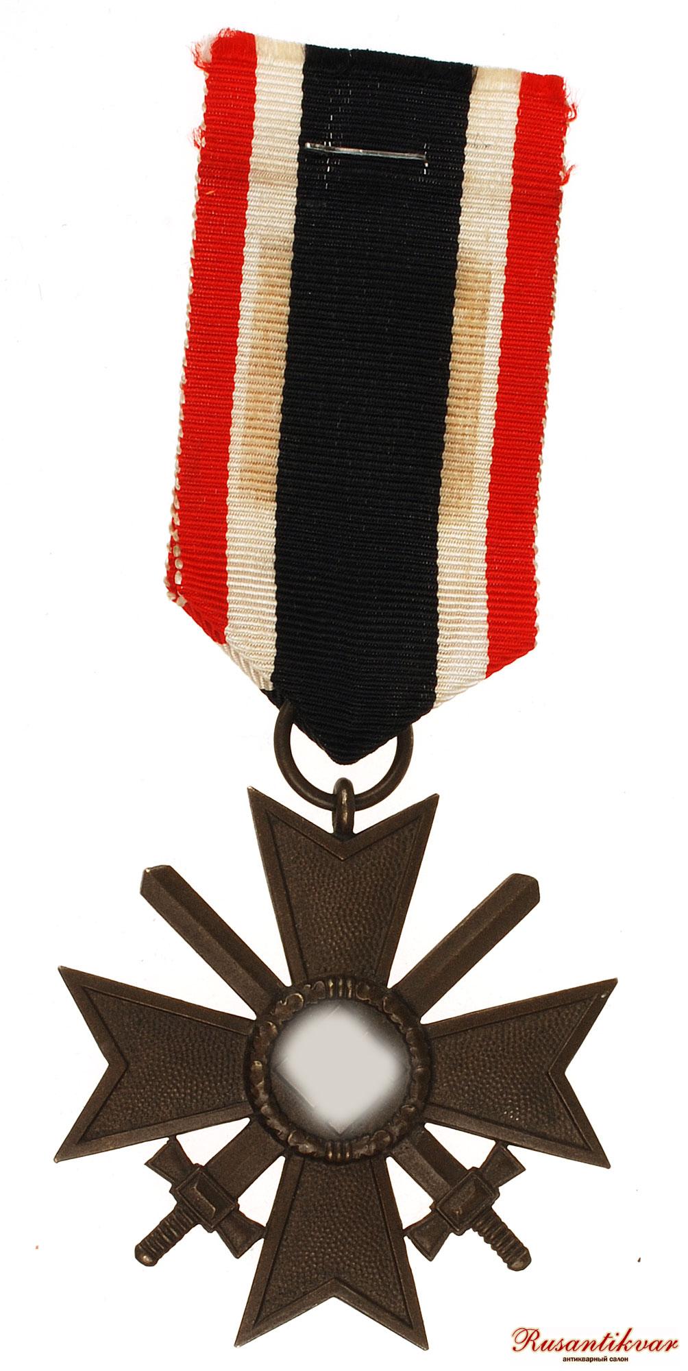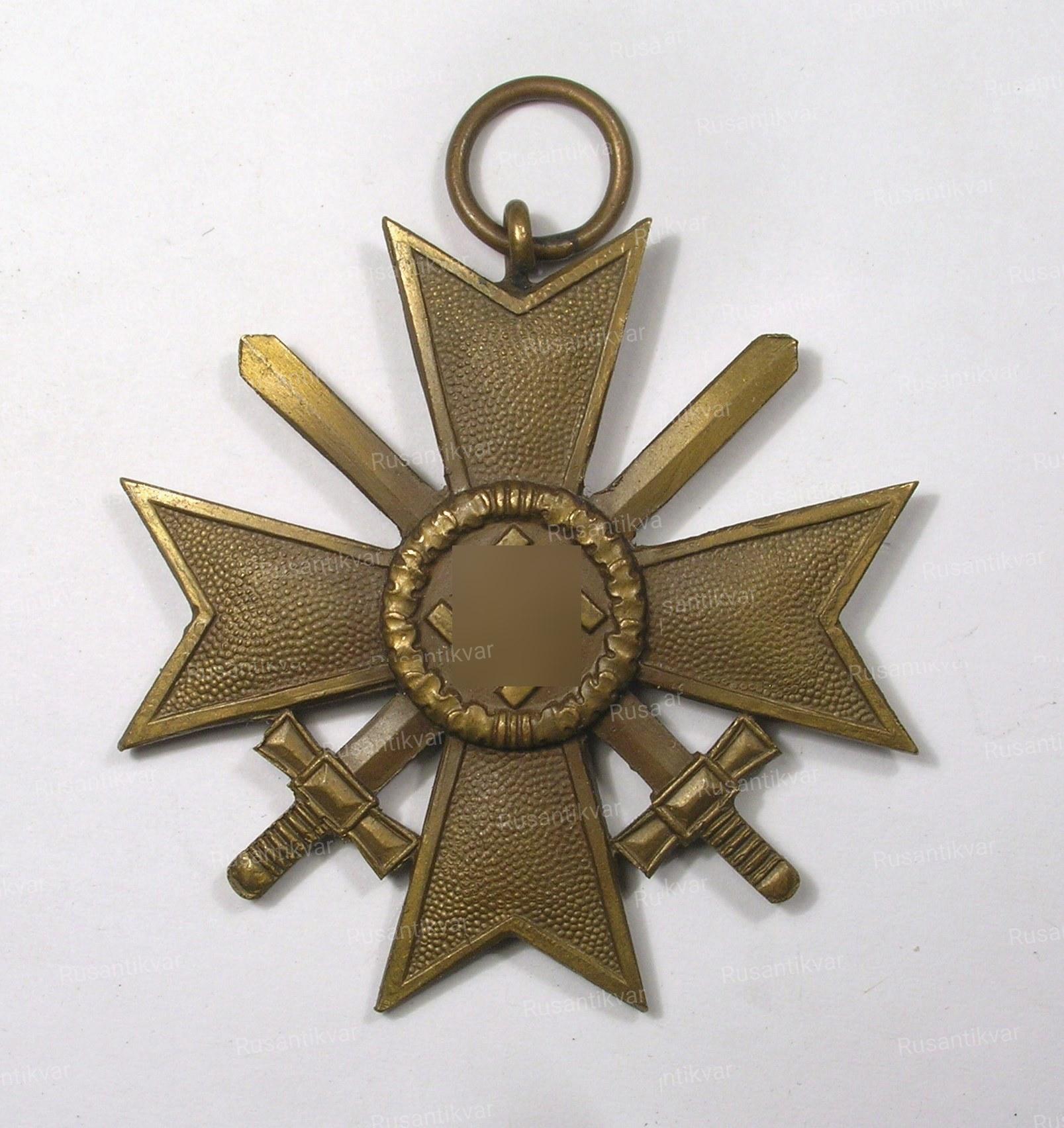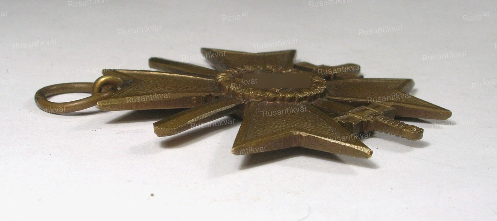 Крест за военные заслуги с мечами вручался военнослужащим за храбрые действия, выходящие за рамки служебного долга, но все же недостаточные для представления к награждению Железным Крестом. Эти действия могли заключаться также, в форме проявленной храбрости и не при прямом вражеском воздействии, а в форме планирования боевых действий или руководства продвижением подразделений. Материал - Бронза.(в конце войны- цинк). На фото - лента - копия.