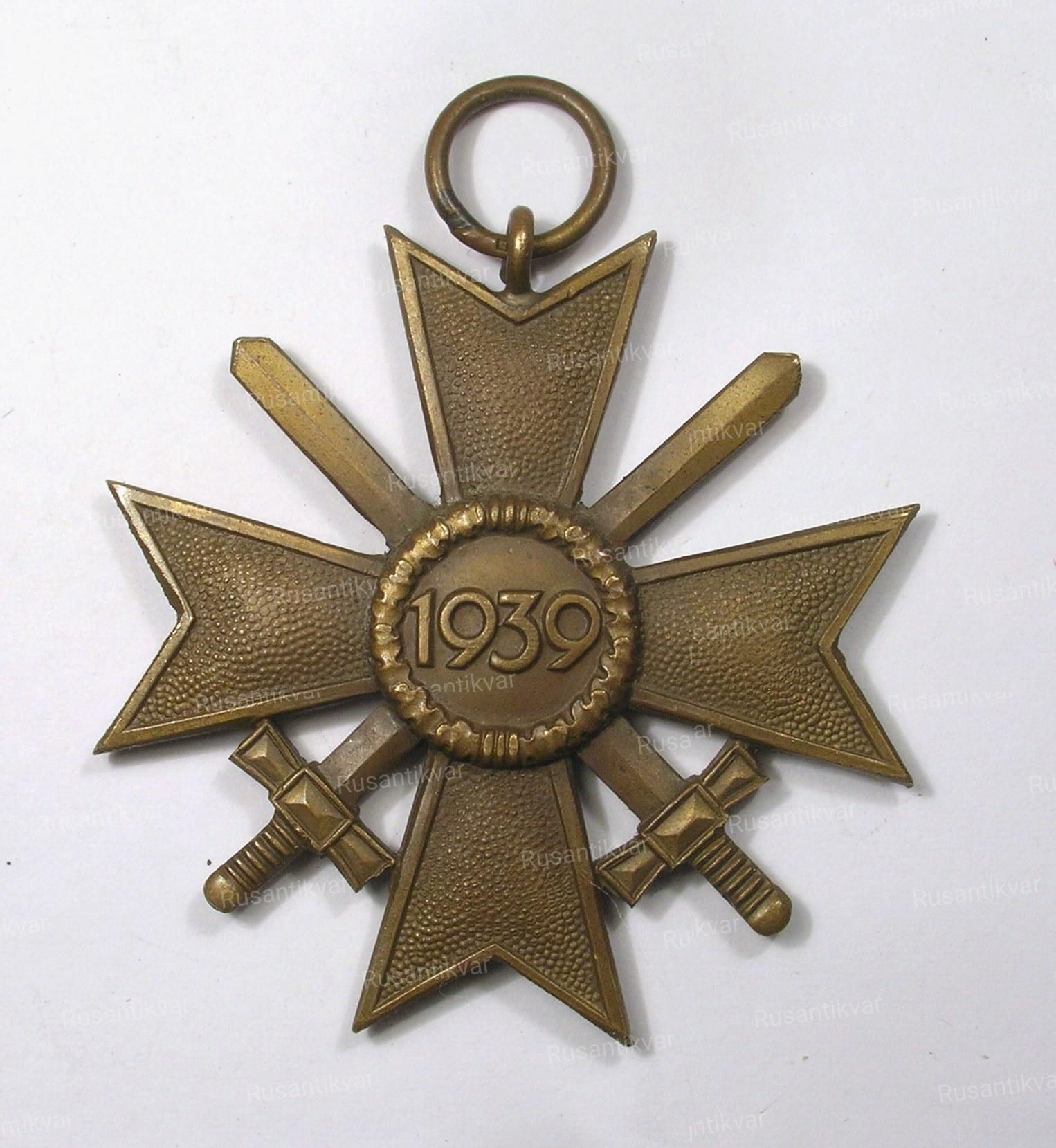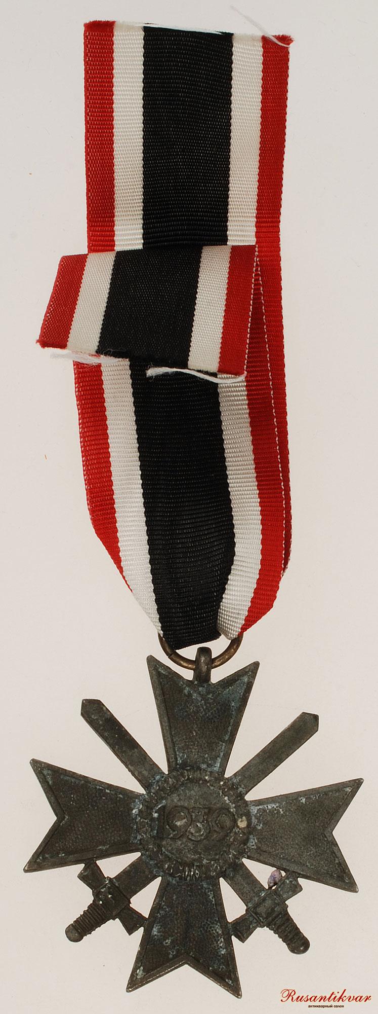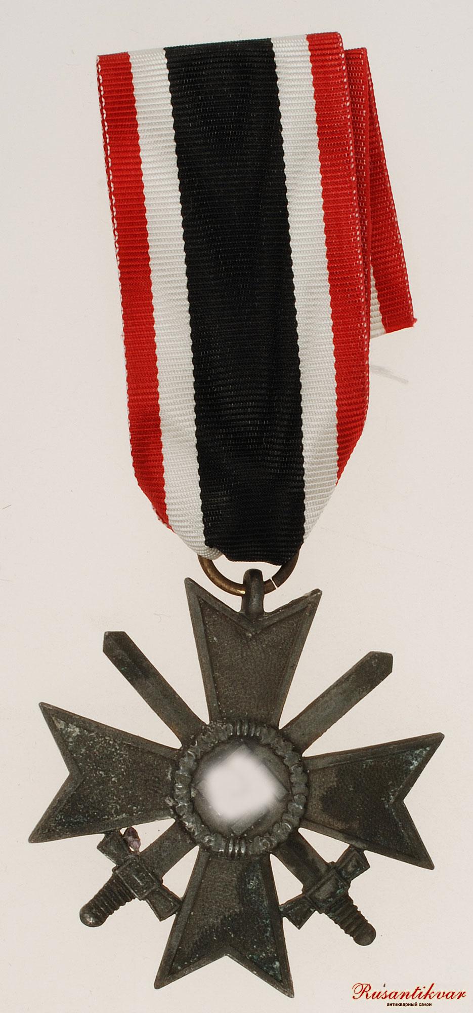 Крест за военные заслуги с мечами вручался военнослужащим за храбрые действия, выходящие за рамки служебного долга, но все же недостаточные для представления к награждению Железным Крестом. Эти действия могли заключаться также, в форме проявленной храбрости и не при прямом вражеском воздействии, а в форме планирования боевых действий или руководства продвижением подразделений. Материал - Бронза.(в конце войны- цинк). На фото - лента - копия.