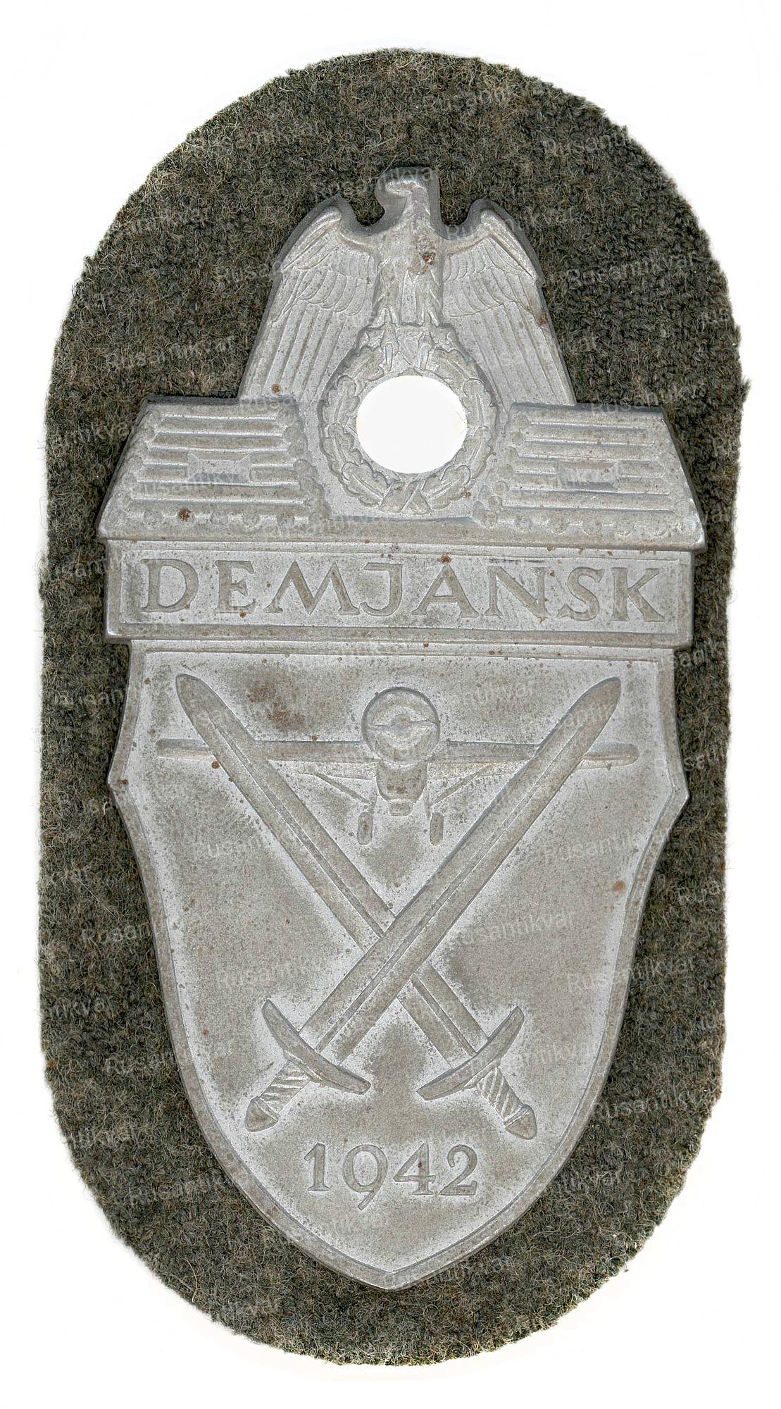 Демянский щит был учрежден 25.04.1943 года для награждения всех воинов находившихся в Демянском котле. Необходимым условием для сухопутных войск было нахождение в котле не менее 60 дней, получение ранения или обморожения, для люфтваффе не менее 50 вылетов в район котла. Всего награды были удостоены более ста тысяч человек.