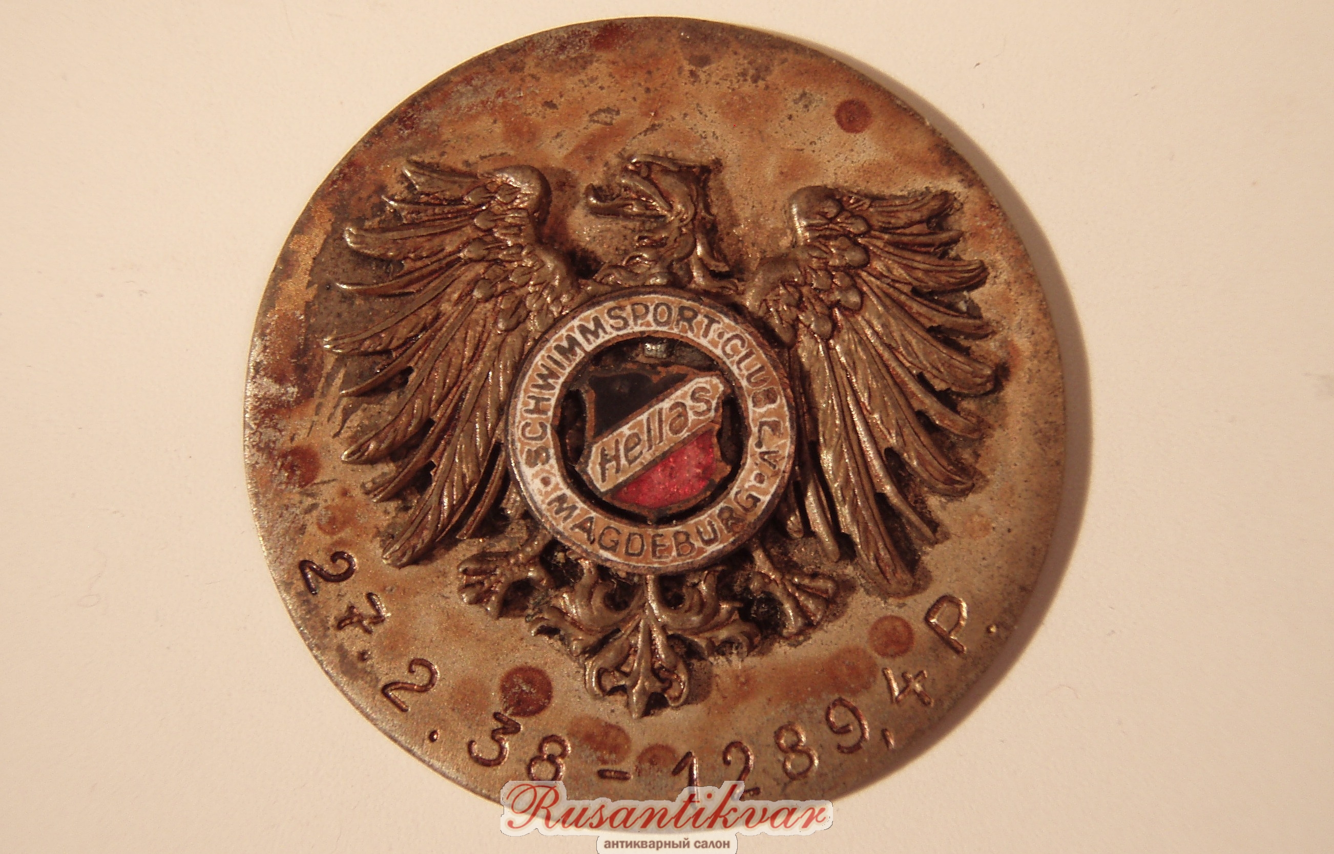 ПЛАВАТЕЛЬНЫЙ КЛУБ. МАГДЕБУРГ. Соревнования 27 февраля 1938 года. 3- х уровневая медаль- на бронзовый круг наложен вырезанный орёл , а на орёл - эмалевый щит.