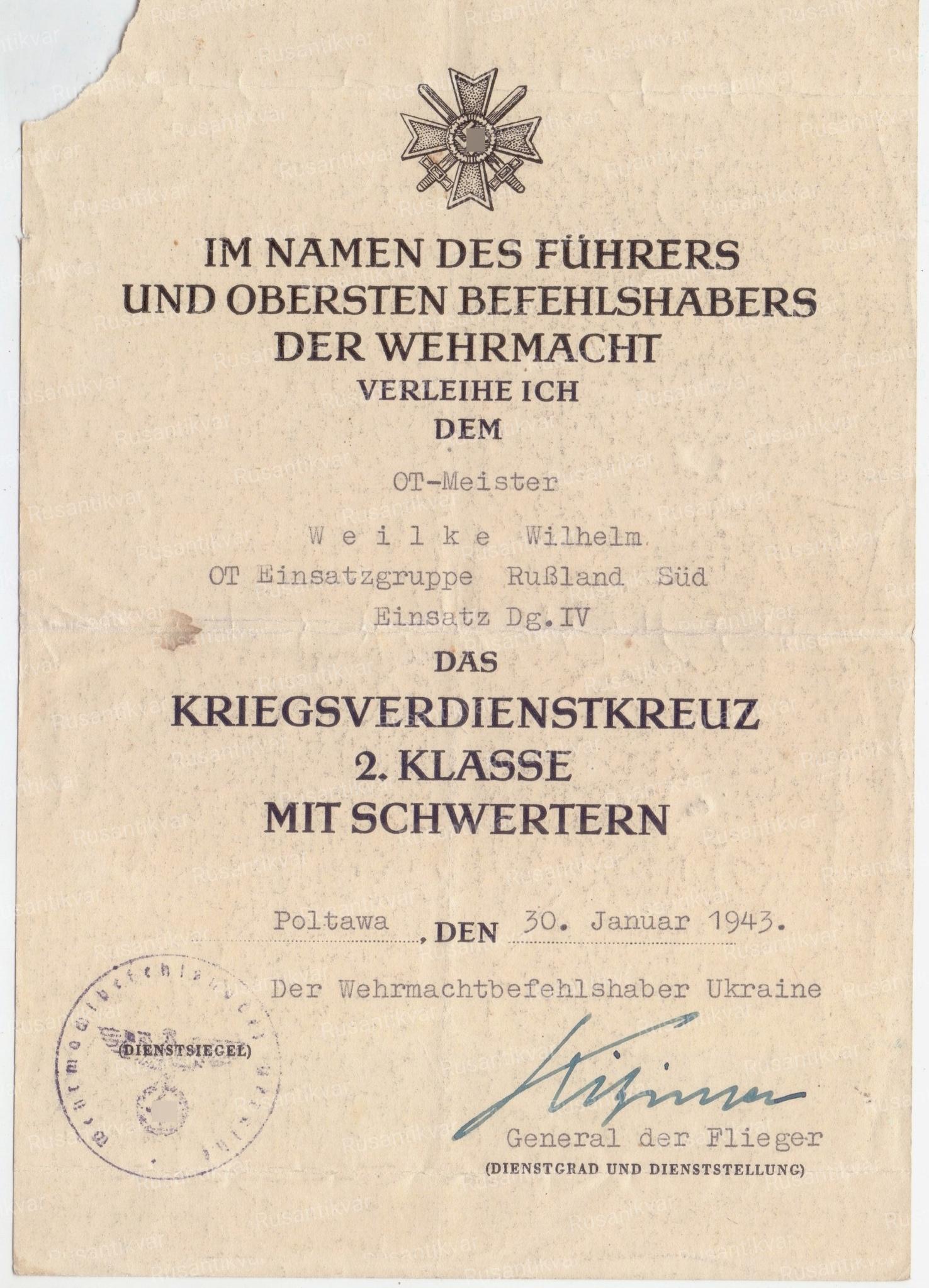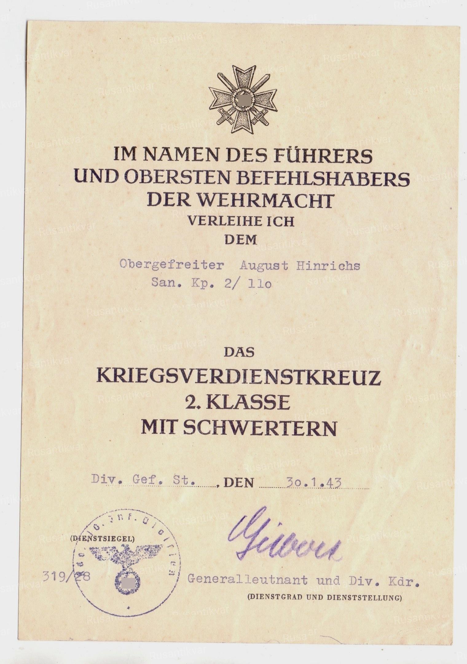 Наградной документ на Крест военных Заслуг 2-го класса с мечами. Вручён оберефрейтору Августу Хенриксу 30 января 1943 года .