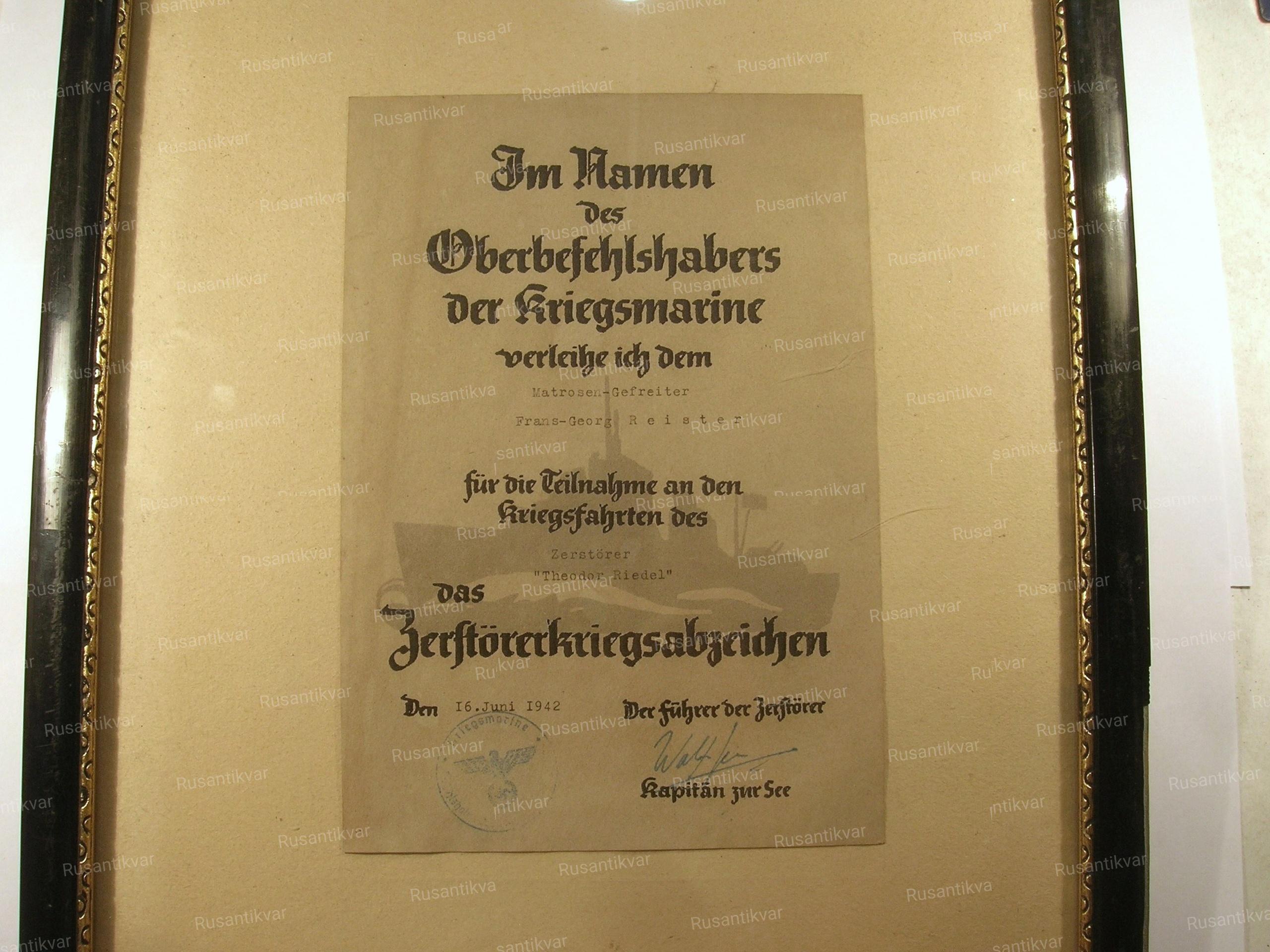 Наградной документ на знак эсминца .