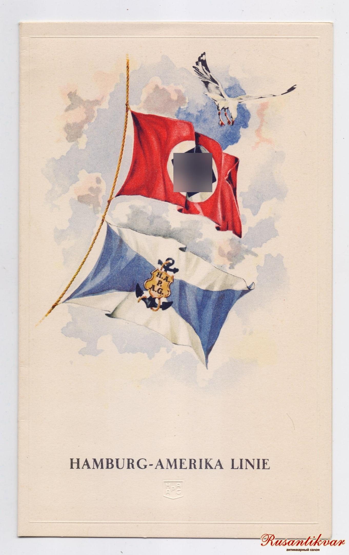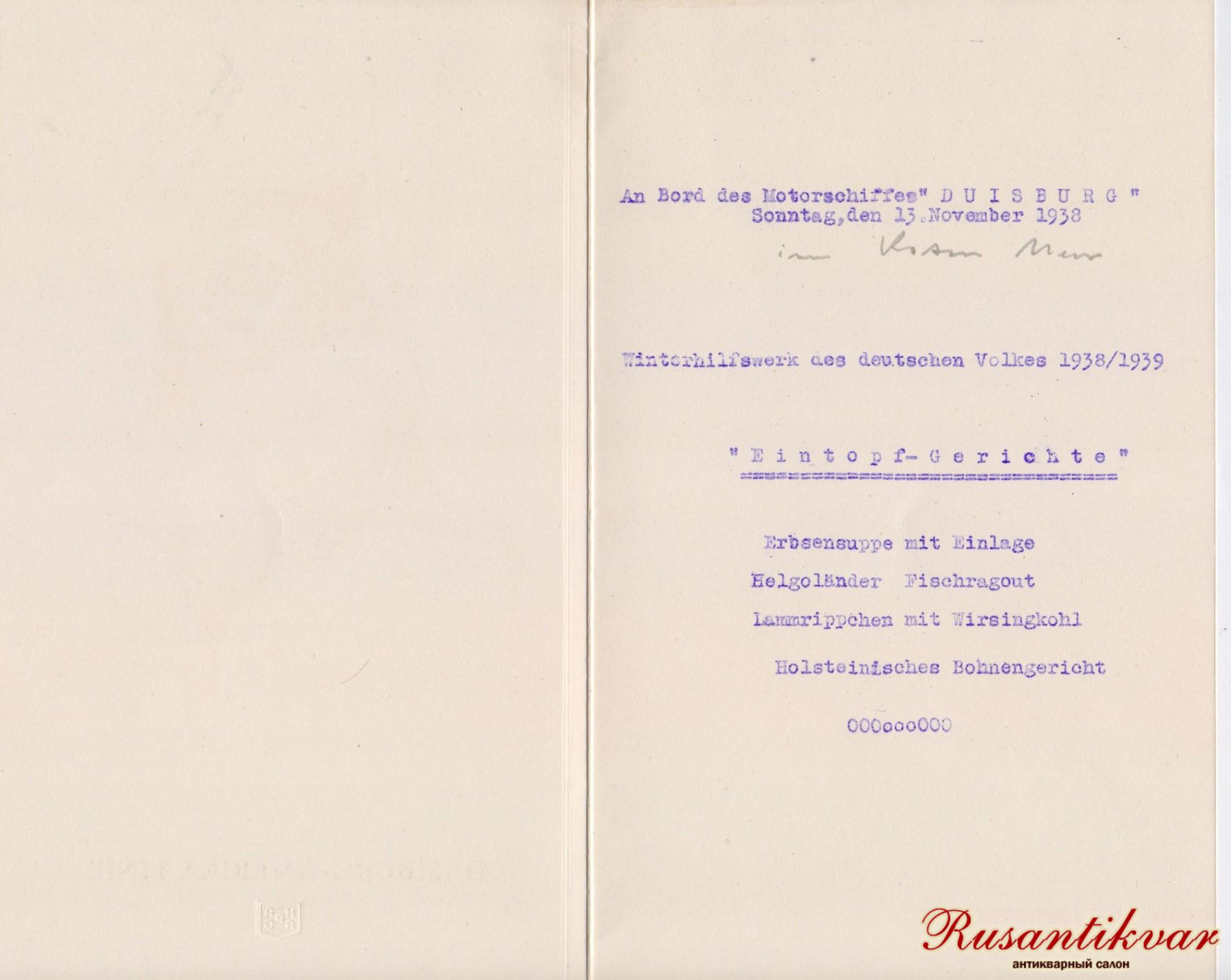 HAPAG (Гамбург — Америка Лайн):Благотворительный круиз WHW 1938/39,корабельное меню.Формат 14х22 см.