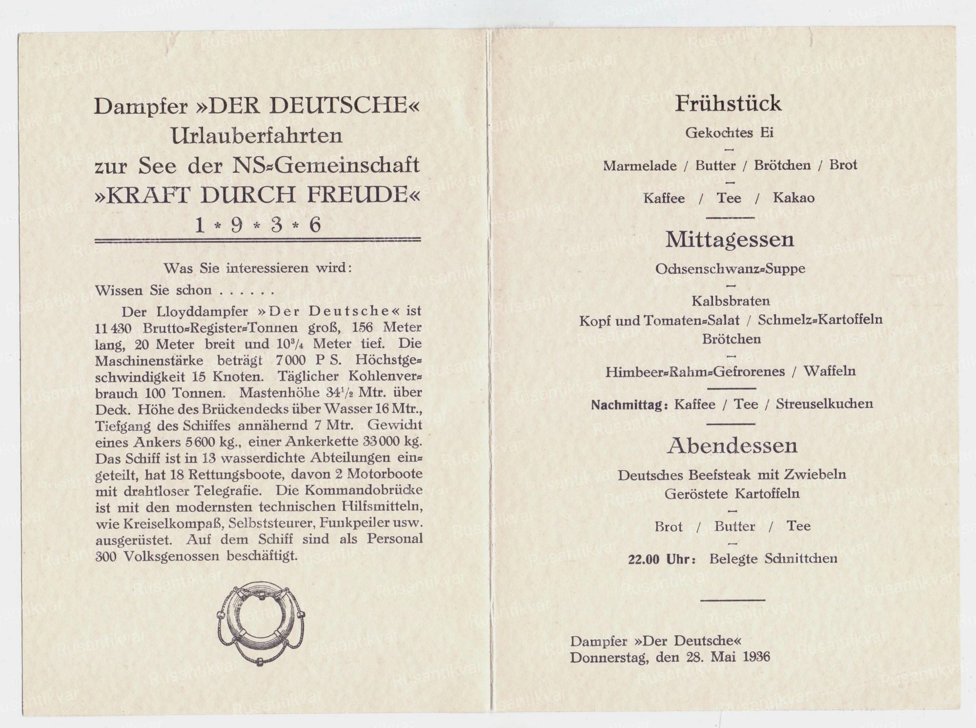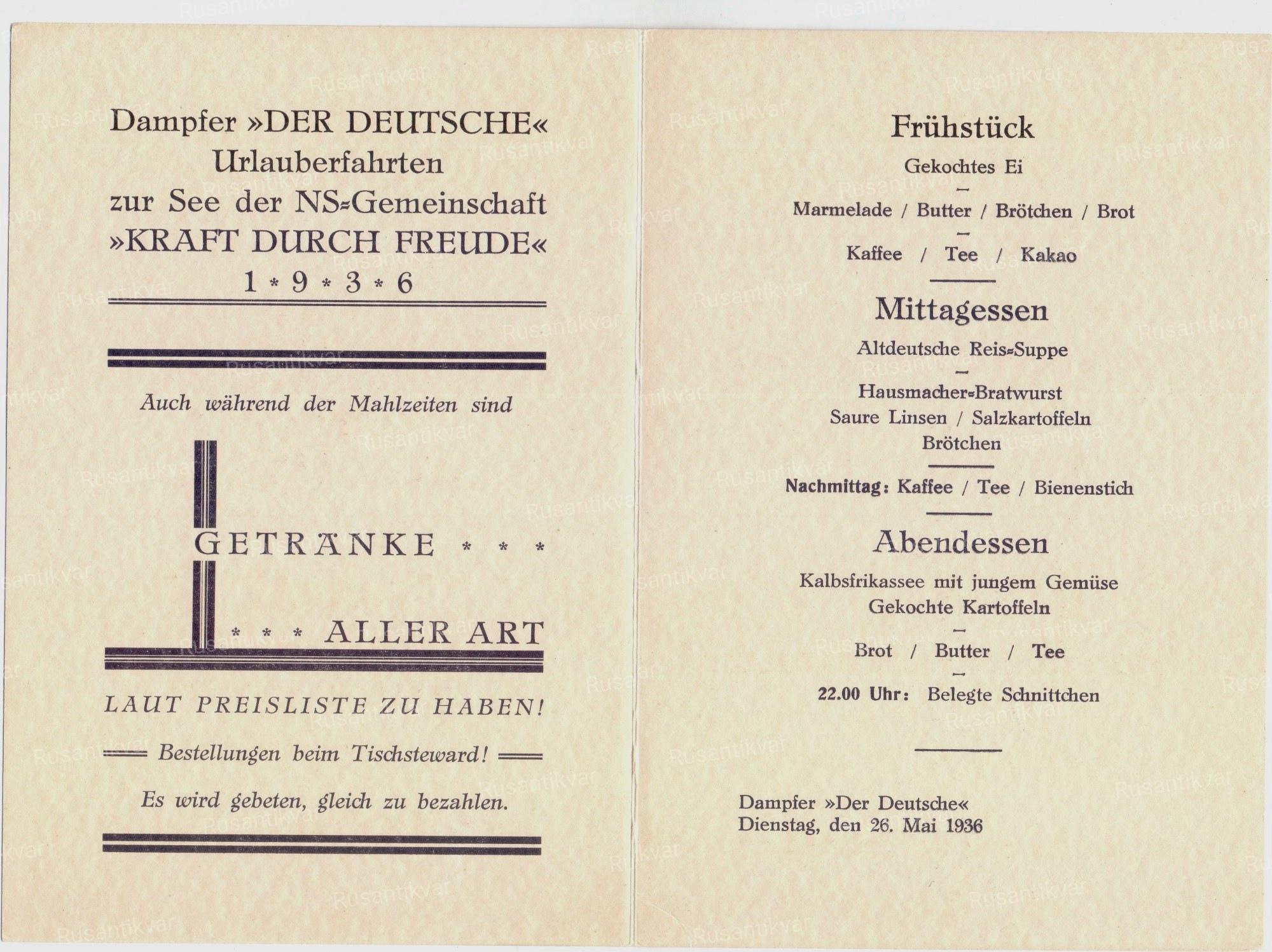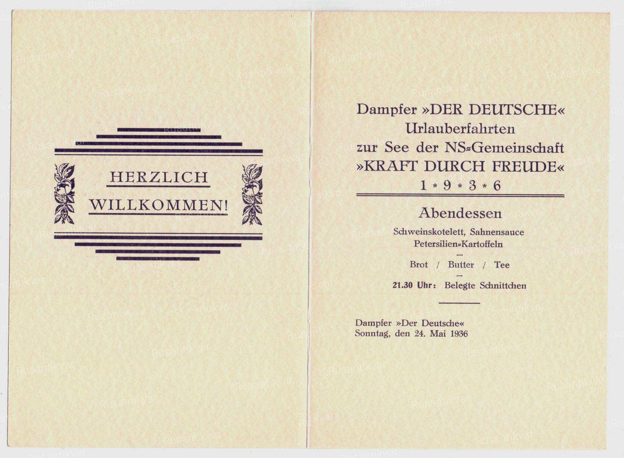 KdF (Национал-социалистическое объединение "Сила через Радость"). Морской круиз на пароходе "Германец" 1936 год . Приглашение на ужин.