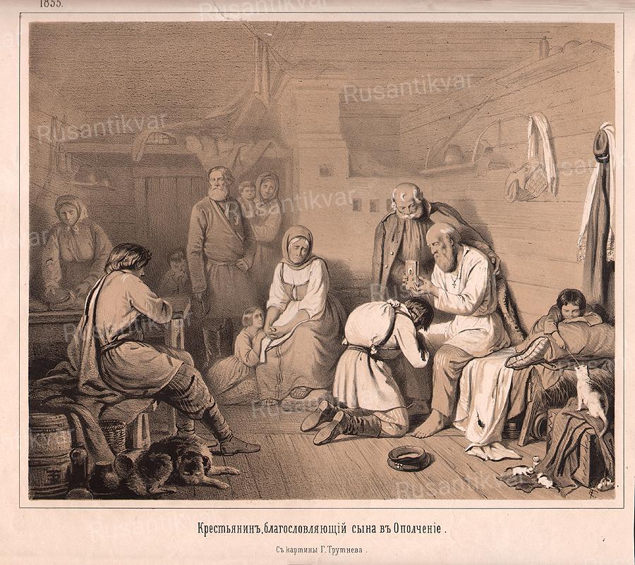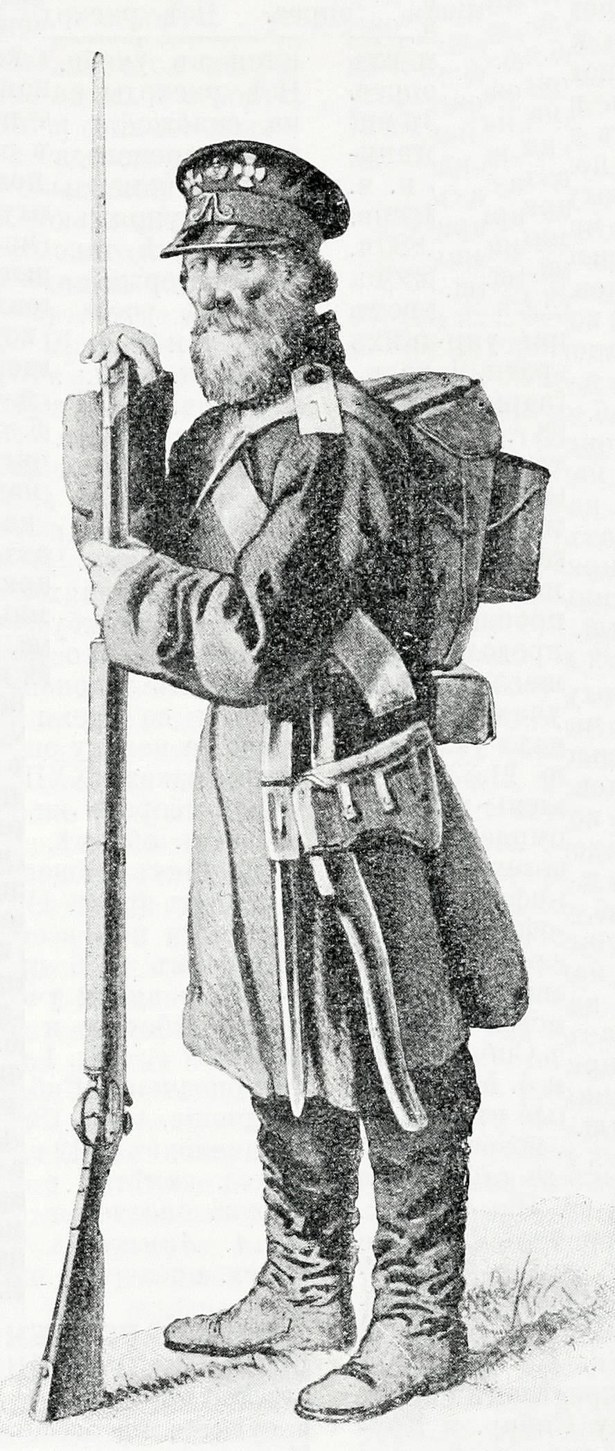 что большинство изображенных на литографии ополченцев – крестьяне среднего возраста. Есть во взводе и георгиевский кавалер (в центре композиции, без бороды, но с усами).
