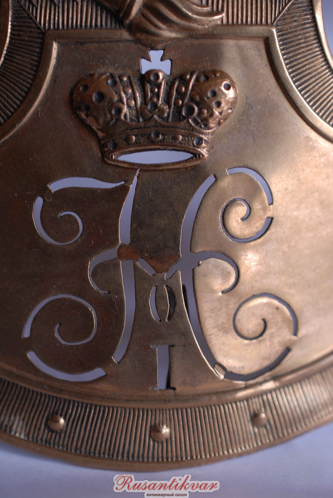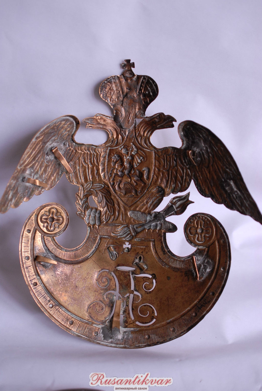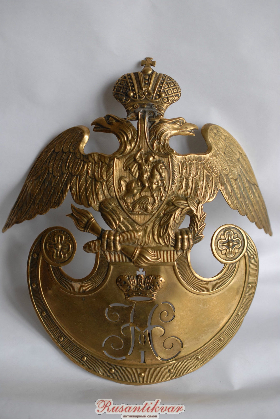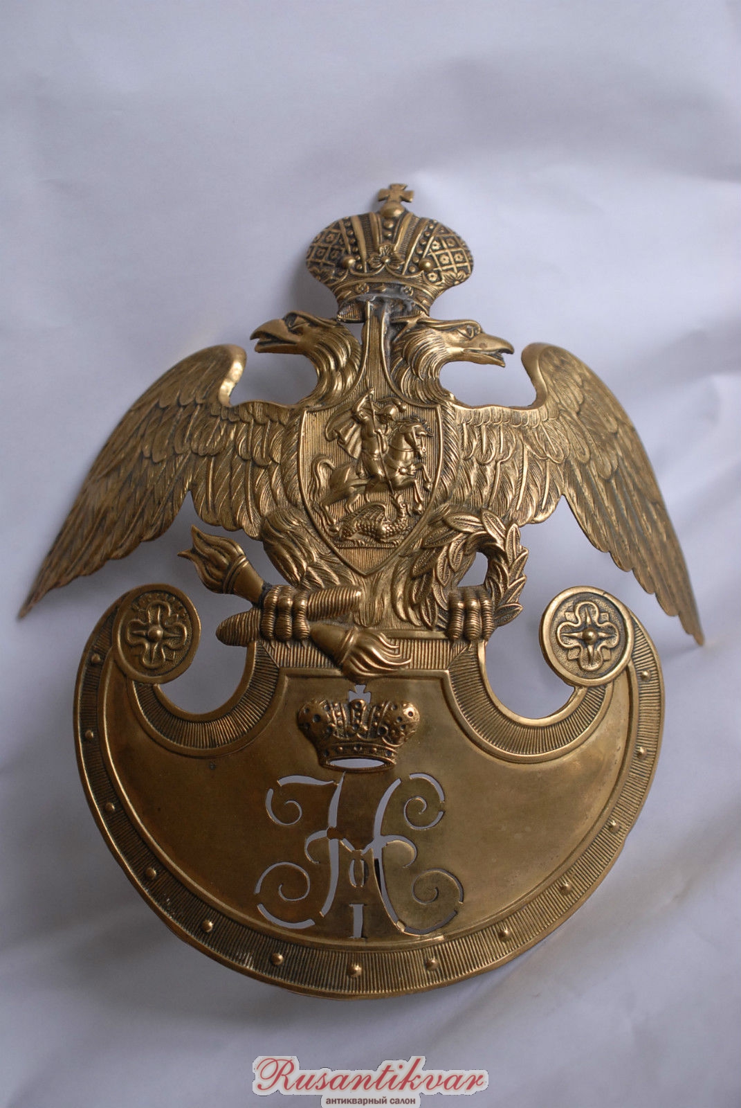 Чуть больше года назад такой герб нижнего чина Фельдъегерского корпуса (трофей Крымской войны) всплыл на аукционе во Франции. Пытался торговаться, но один невменяемый барыга (из Прибалтики, по-моему), не понимая ничего в подобных вещах, набил за него более 1700 евро (вернее, перебил эту мою ставку), а после попытался лихорадочно продать его, еще не получив на руки, в том числе и на виолити, за 2500 евро. Поскольку желающих покормить идиота не нашлось, то выкупать предмет он не стал, и вещь снова ушла в небытие. Фото с того аукциона.
