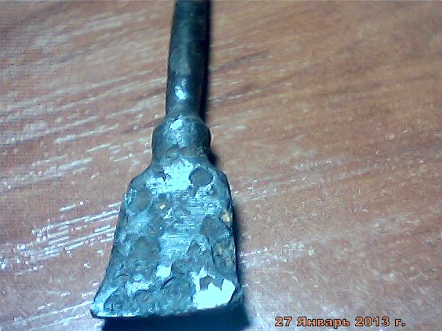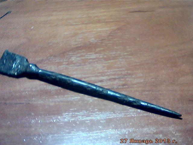 Попался вот такой предмет.Есть предположение что это писало для бересты.Хотя может быть заколка от фибулы и вообще что угодно.Длинна этой штуки где-то 12 см.А форма на фотографии: