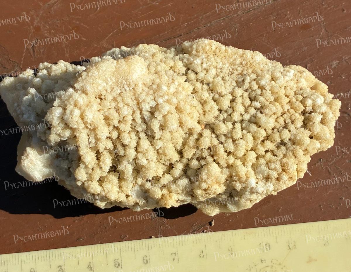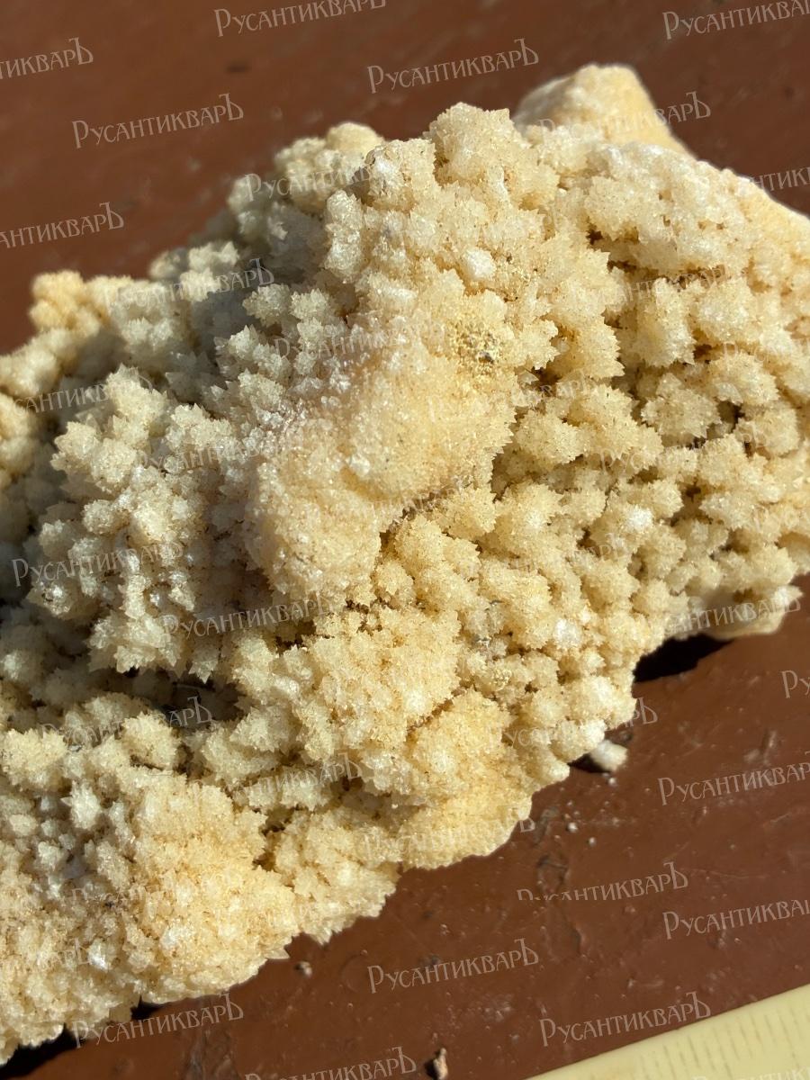 * Образует кристаллические двойники и сростки кристаллов, друзы, щётки, плотные и зернистые массы, натёчные агрегаты (сталактиты, сталагмиты).