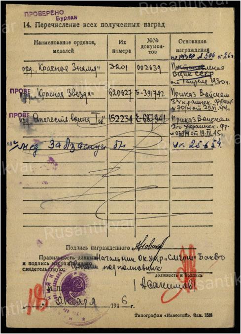 Прочие сведения: В 1945 году - майор, начальник отдела контрразведки "СМЕРШ" 14 мото-механизированной бригады.