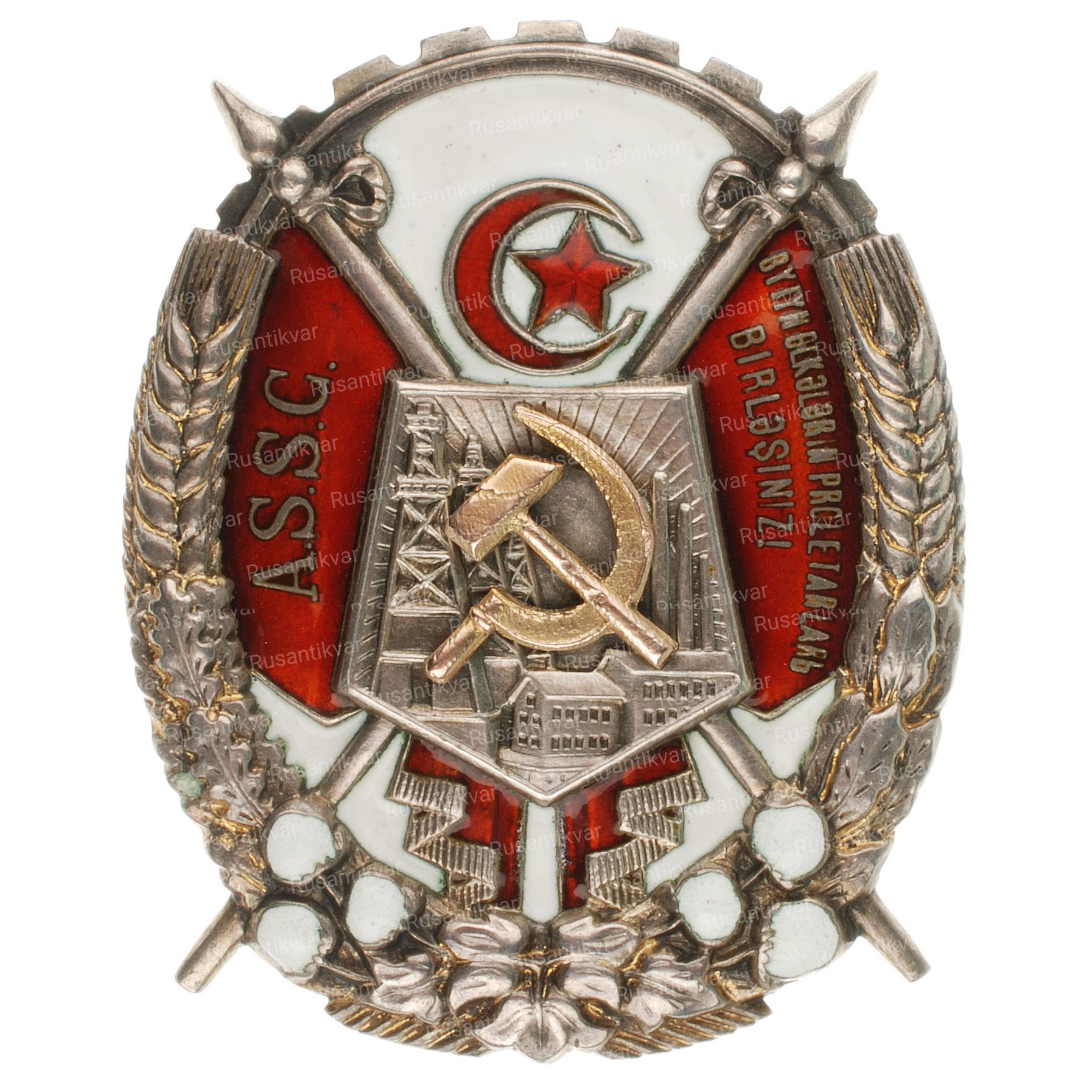 Вверху между двумя древками знамен на белой эмалевой основе азербайджанская эмблема, обращенный вправо полумесяц, внутри которого пятиконечная звезда из красной эмали. Справа на знамени надпись на азербайджанском языке (латинской графикой): «Bütün ölkələrin proletariatları, birləsiniz!». Слева аббревиатура A.S.S.C. (Azərbaycan Sovet Sosialist Cümhuriyyəti).